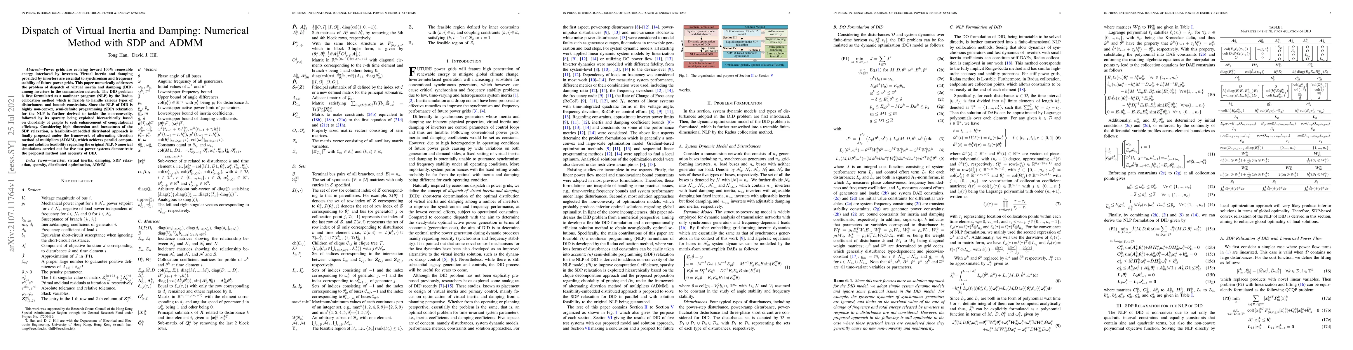This paper proposes a method for dispatching virtual inertia and damping among inverters to ensure power grid stability, formulated as a nonlinear program. It employs semi-definite programming relaxation and distributed ADMM to address the high dimensionality and non-convexity, achieving parallel computation and solution feasibility.