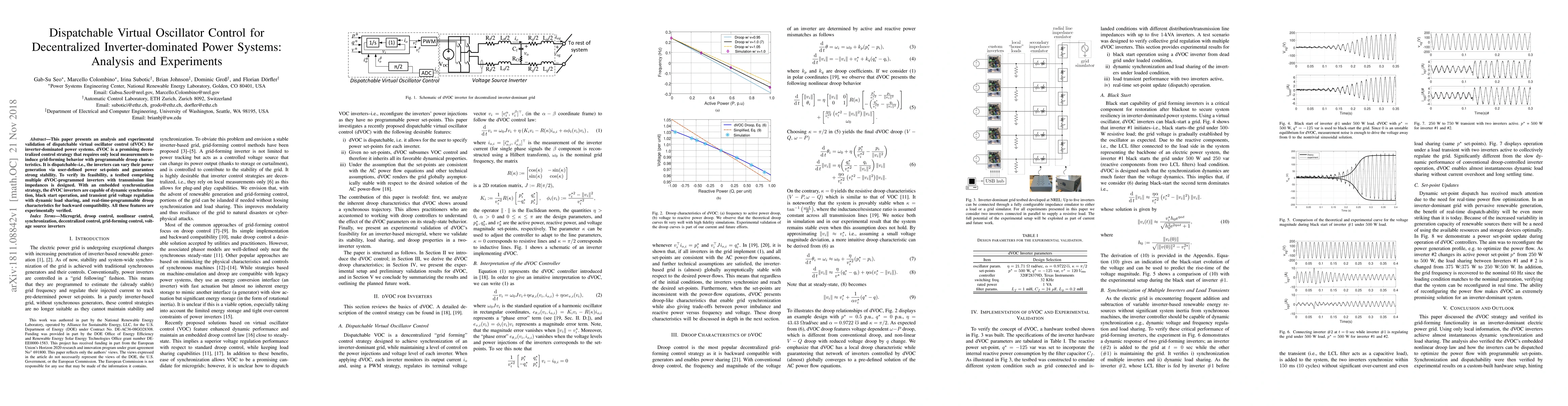 This paper analyzes and experimentally validates dispatchable virtual oscillator control (dVOC) for decentralized inverter-dominated power systems, demonstrating its capability for dynamic synchronization, black start operation, and grid voltage regulation with programmable droop characteristics. Experimental results confirm the strong stability and flexibility of dVOC inverters.