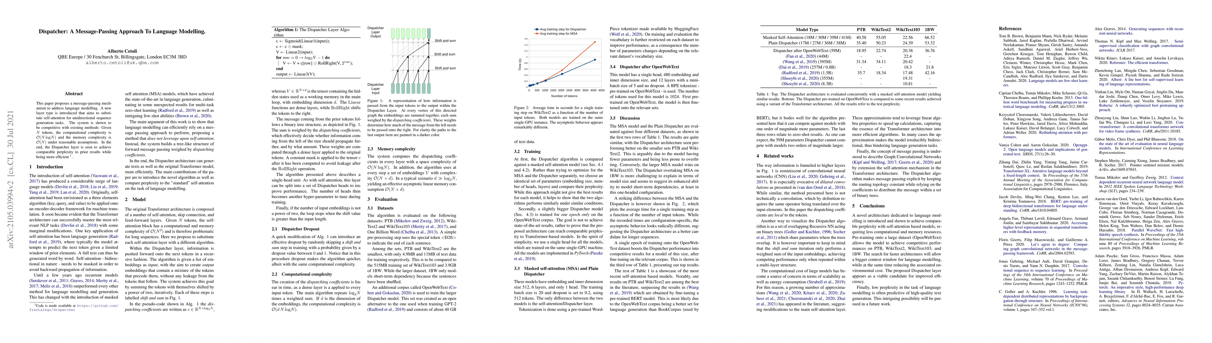 This paper proposes a message-passing mechanism to address language modelling. A new layer type is introduced that aims to substitute self-attention for unidirectional sequence generation tasks. The system is shown to be competitive with existing methods: Given N tokens, the computational complexity is O(N logN) and the memory complexity is O(N) under reasonable assumptions. In the end, the Dispatcher layer is seen to achieve comparable perplexity to prior results while being more efficient.