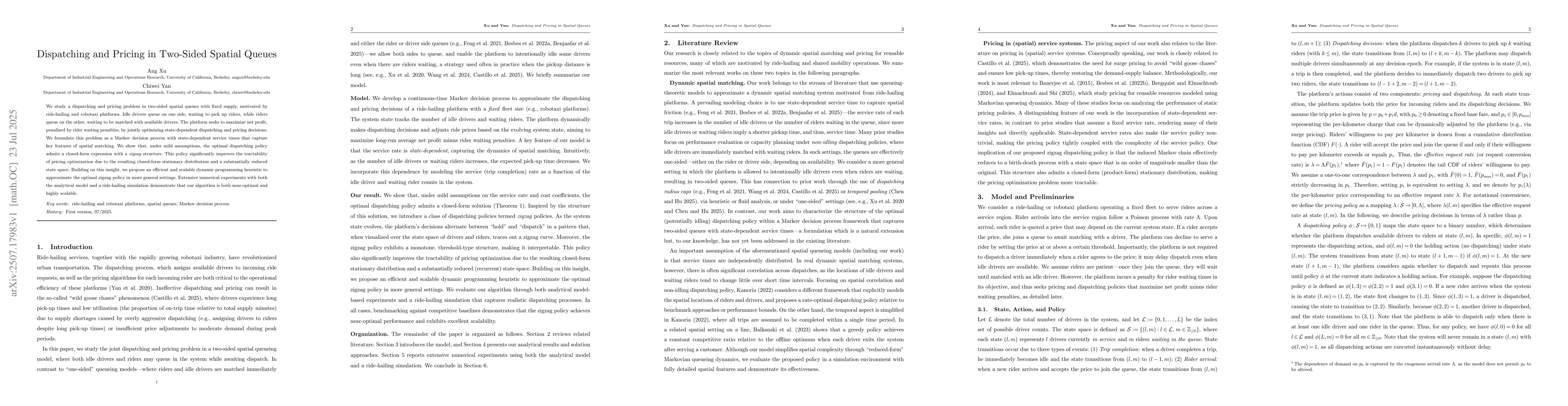 We study a dispatching and pricing problem in two-sided spatial queues with fixed supply, motivated by ride-hailing and robotaxi platforms. Idle drivers queue on one side, waiting to pick up riders, while riders queue on the other, waiting to be matched with available drivers. The platform seeks to maximize net profit, penalized by rider waiting penalties, by jointly optimizing state-dependent dispatching and pricing decisions. We formulate this problem as a Markov decision process with state-dependent service times that capture key features of spatial matching. We show that, under mild assumptions, the optimal dispatching policy admits a closed-form expression with a zigzag structure. This policy significantly improves the tractability of pricing optimization due to the resulting closed-form stationary distribution and a substantially reduced state space. Building on this insight, we propose an efficient and scalable dynamic programming heuristic to approximate the optimal zigzag policy in more general settings. Extensive numerical experiments with both the analytical model and a ride-hailing simulation demonstrate that our algorithm is both near-optimal and highly scalable.