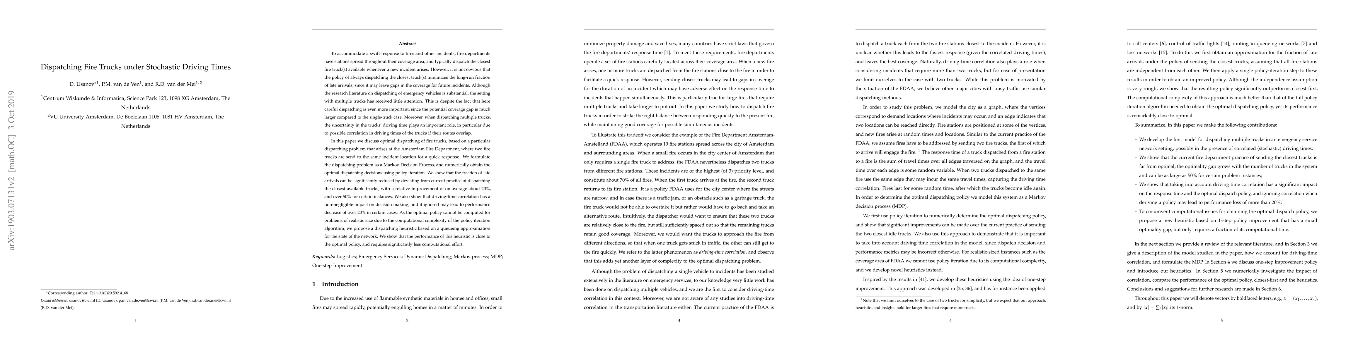 In this paper we discuss optimal dispatching of fire trucks, based on a particular dispatching problem that arises at the Amsterdam Fire Department, where two fire trucks are send to the same incident location for a quick response. We formulate the dispatching problem as a Markov Decision Process, and numerically obtain the optimal dispatching decisions using policy iteration. We show that the fraction of late arrivals can be significantly reduced by deviating from current practice of dispatching the closest available trucks, with a relative improvement of on average about $20\%$, and over $50\%$ for certain instances. We also show that driving-time correlation has a non-negligible impact on decision making, and if ignored may lead to performance decrease of over $20\%$ in certain cases. As the optimal policy cannot be computed for problems of realistic size due to the computational complexity of the policy iteration algorithm, we propose a dispatching heuristic based on a queueing approximation for the state of the network. We show that the performance of this heuristic is close to the optimal policy, and requires significantly less computational effort.