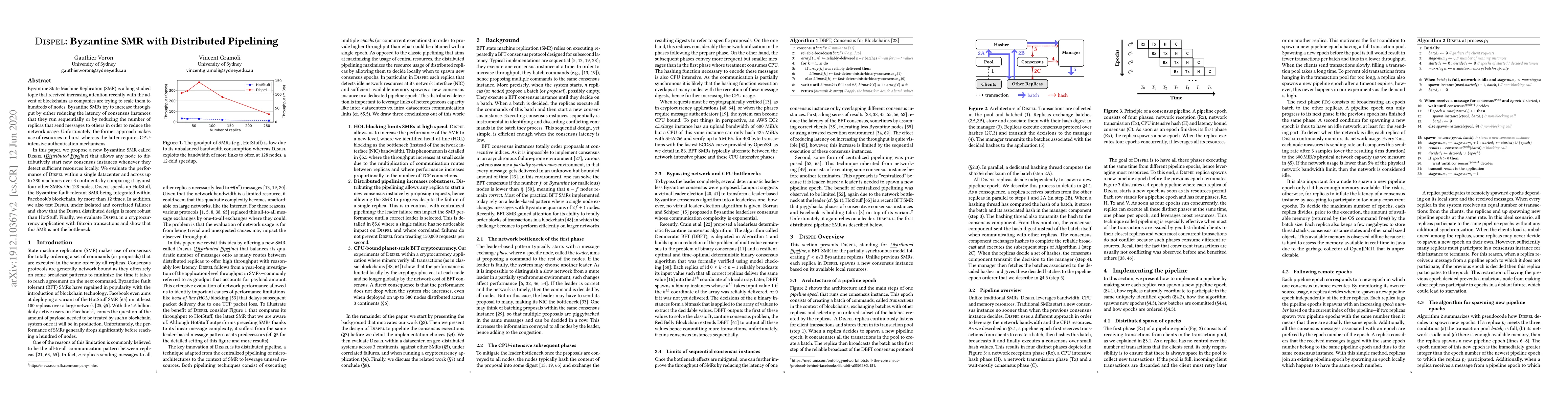 Dispel introduces a novel distributed pipelining approach for Byzantine fault-tolerant state machine replication, which balances network load by allowing any replica to start new consensus instances when sufficient resources are detected locally.