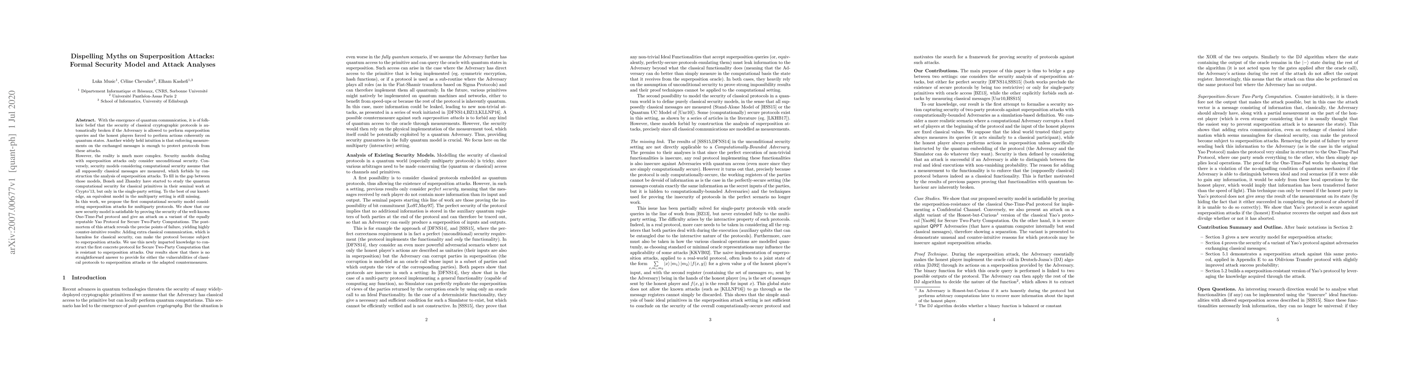 This paper proposes a novel computational security model for multiparty protocols to analyze superposition attacks, demonstrating that classical cryptographic protocols are not inherently vulnerable to such attacks. It reveals that extra classical communication can inadvertently expose protocols to superposition attacks, leading to the development of a new Secure Two-Party Computation protocol resistant to these attacks.
