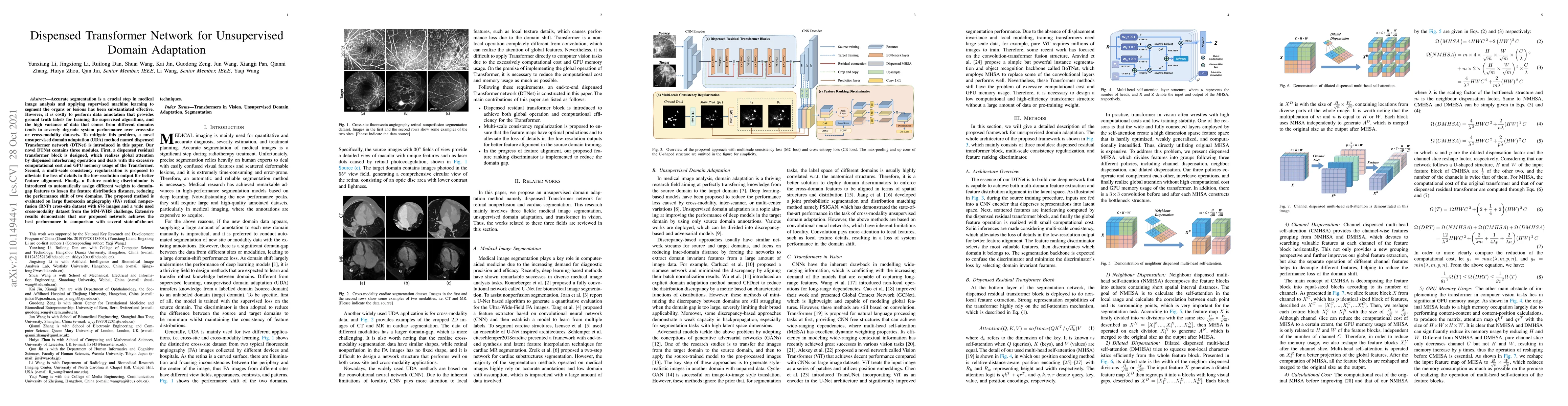 Accurate segmentation is a crucial step in medical image analysis and applying supervised machine learning to segment the organs or lesions has been substantiated effective. However, it is costly to perform data annotation that provides ground truth labels for training the supervised algorithms, and the high variance of data that comes from different domains tends to severely degrade system performance over cross-site or cross-modality datasets. To mitigate this problem, a novel unsupervised domain adaptation (UDA) method named dispensed Transformer network (DTNet) is introduced in this paper. Our novel DTNet contains three modules. First, a dispensed residual transformer block is designed, which realizes global attention by dispensed interleaving operation and deals with the excessive computational cost and GPU memory usage of the Transformer. Second, a multi-scale consistency regularization is proposed to alleviate the loss of details in the low-resolution output for better feature alignment. Finally, a feature ranking discriminator is introduced to automatically assign different weights to domain-gap features to lessen the feature distribution distance, reducing the performance shift of two domains. The proposed method is evaluated on large fluorescein angiography (FA) retinal nonperfusion (RNP) cross-site dataset with 676 images and a wide used cross-modality dataset from the MM-WHS challenge. Extensive results demonstrate that our proposed network achieves the best performance in comparison with several state-of-the-art techniques.