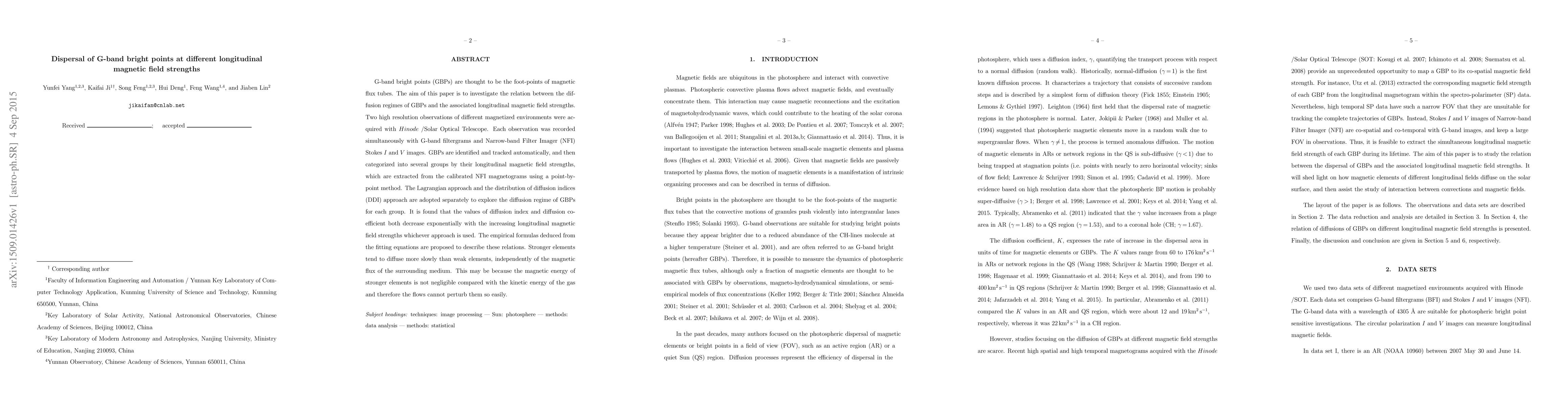 This paper investigates the relationship between the dispersal of G-band bright points (GBPs) and their associated longitudinal magnetic field strengths using high-resolution observations from the Hinode/Solar Optical Telescope. It finds that both the diffusion index and coefficient decrease exponentially with increasing magnetic field strength, suggesting stronger magnetic elements diffuse more slowly due to their significant magnetic energy.