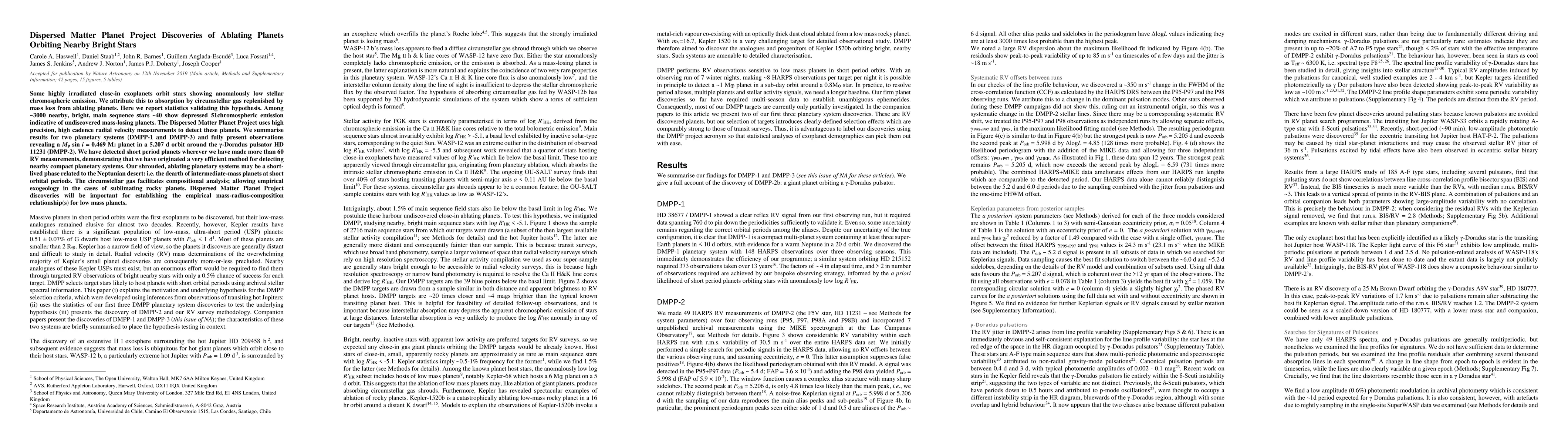 Some highly irradiated close-in exoplanets orbit stars showing anomalously low stellar chromospheric emission. We attribute this to absorption by circumstellar gas replenished by mass loss from ablating planets. Here we report statistics validating this hypothesis. Among ~3000 nearby, bright, main sequence stars ~40 show depressed chromospheric emission indicative of undiscovered mass-losing planets. The Dispersed Matter Planet Project uses high precision, high cadence radial velocity measurements to detect these planets. We summarise results for two planetary systems (DMPP-1 and DMPP-3) and fully present observations revealing a Mp sin i = 0.469 M$_{\rm J}$ planet in a 5.207 d orbit around the $\gamma$-Doradus pulsator HD 11231 (DMPP-2). We have detected short period planets wherever we have made more than 60 RV measurements, demonstrating that we have originated a very efficient method for detecting nearby compact planetary systems. Our shrouded, ablating planetary systems may be a short-lived phase related to the Neptunian desert: i.e. the dearth of intermediate-mass planets at short orbital periods. The circumstellar gas facilitates compositional analysis; allowing empirical exogeology in the cases of sublimating rocky planets. Dispersed Matter Planet Project discoveries will be important for establishing the empirical mass-radius-composition relationship(s) for low mass planets.