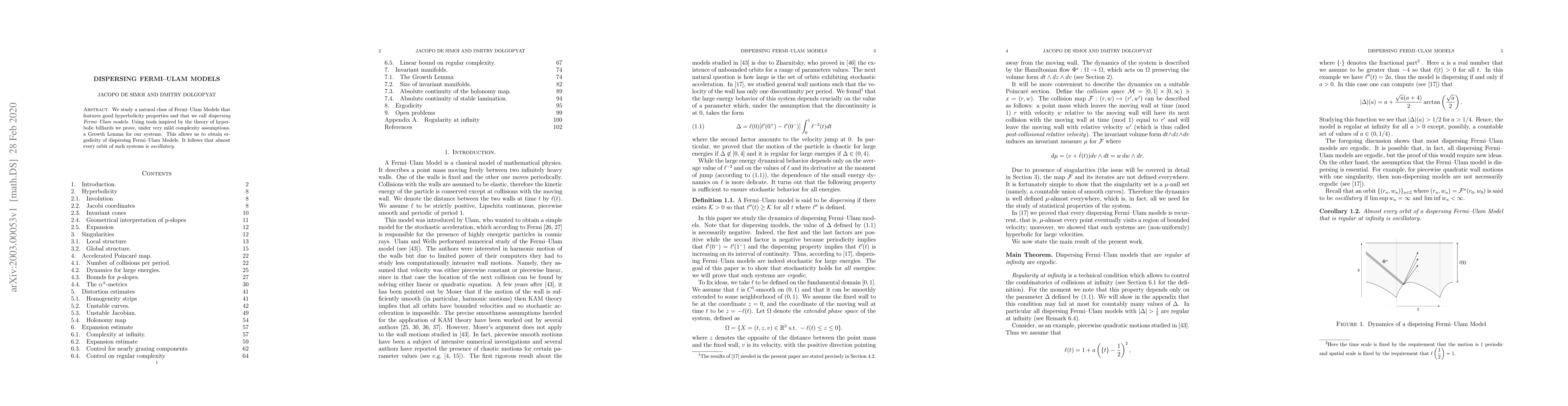 We study a natural class of Fermi-Ulam Models that features good hyperbolicity properties and that we call dispersing Fermi-Ulam models. Using tools inspired by the theory of hyperbolic billiards we prove, under very mild complexity assumptions, a Growth Lemma for our systems. This allows us to obtain ergodicity of dispersing Fermi-Ulam Models. It follows that almost every orbit of such systems is oscillatory.