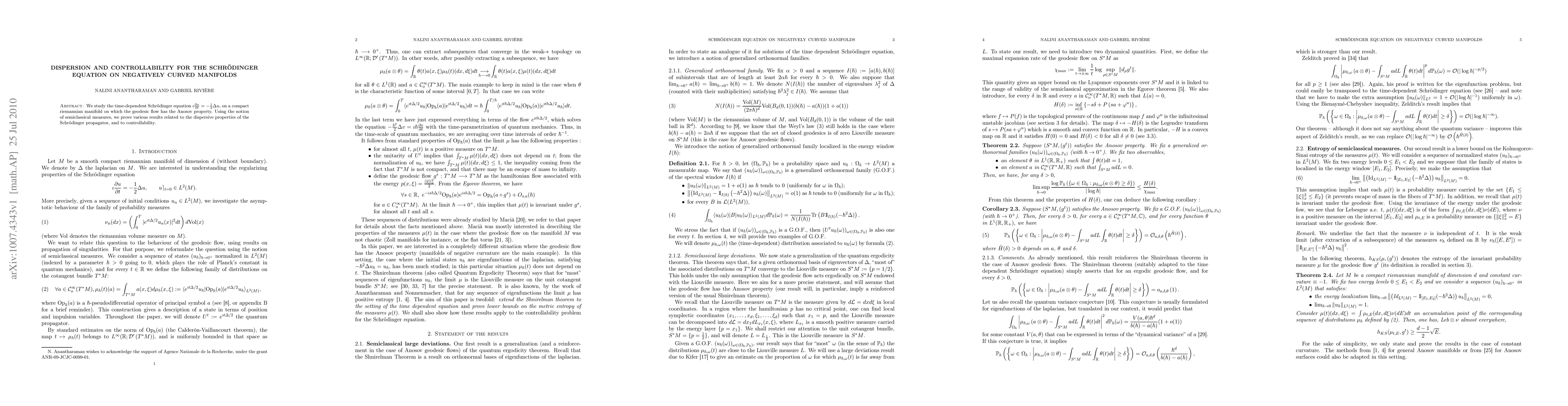 This paper investigates the dispersive properties and controllability of the time-dependent Schrödinger equation on negatively curved manifolds with Anosov geodesic flow, utilizing semiclassical measures to derive significant results.