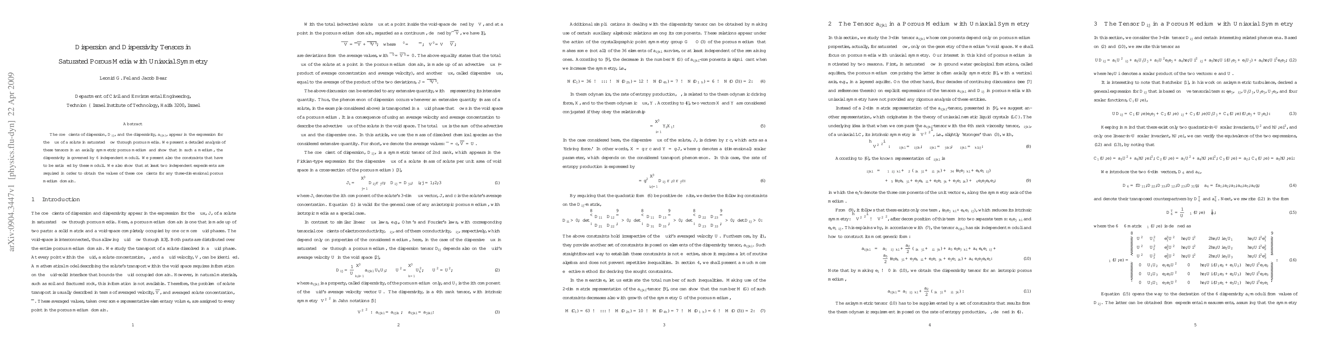 This paper analyzes the dispersion and dispersivity tensors in axially symmetric saturated porous media, revealing that dispersivity is determined by six independent moduli with specific constraints. It concludes that at least two independent experiments are necessary to determine these coefficients in any three-dimensional porous medium.