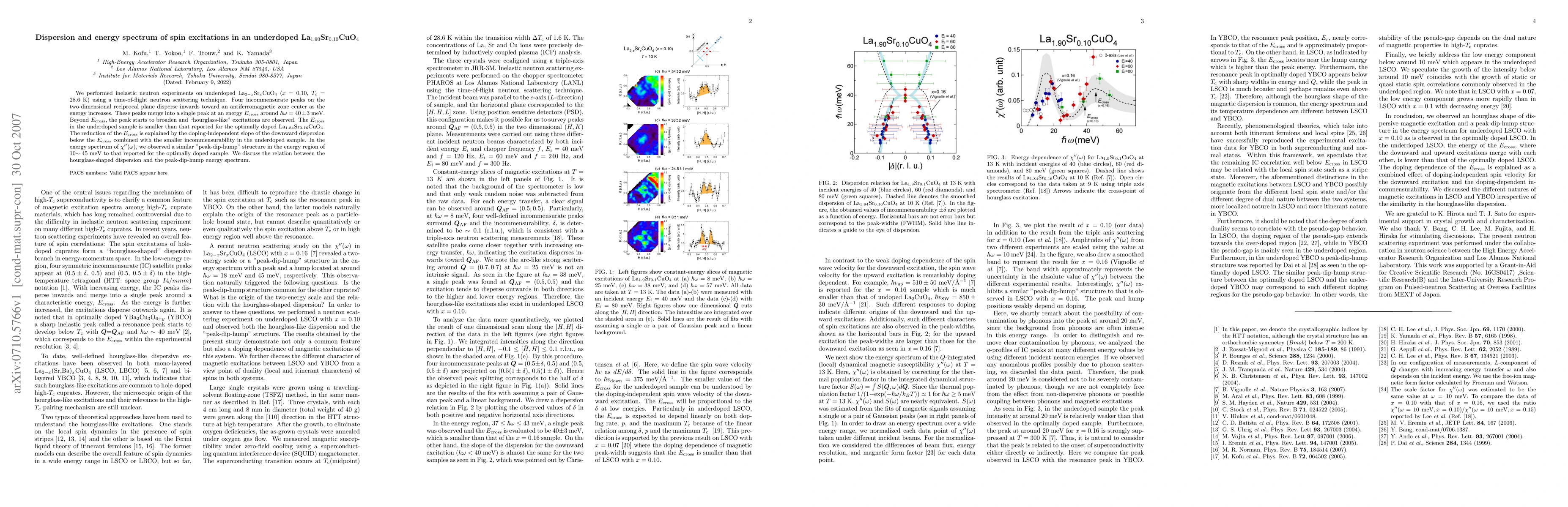 We performed inelastic neutron experiments on underdoped La_2-xSr_xCuO_4(x=0.10, T_c=28.6K) using a time-of-flight neutron scattering technique. Four incommensurate peaks on the two-dimensional reciprocal plane disperse inwards toward an antiferromagnetic zone center as the energy increases. These peaks merge into a single peak at an energy E_cross around w=40+-3meV. Beyond E_cross, the peak starts to broaden and ``hourglass-like'' excitations are observed. The E_cross in the underdoped sample is smaller than that reported for the optimally doped La_1.84Sr_0.16CuO_4. The reduction of the E_cross is explained by the doping-independent slope of the downward dispersion below the E_cross combined with the smaller incommensurability in the underdoped sample. In the energy spectrum of chi"(w), we observed a similar "peak-dip-hump" structure in the energy region of 10~45meV to that reported for the optimally doped sample. We discuss the relation between the hourglass-shaped dispersion and the peak-dip-hump energy spectrum.