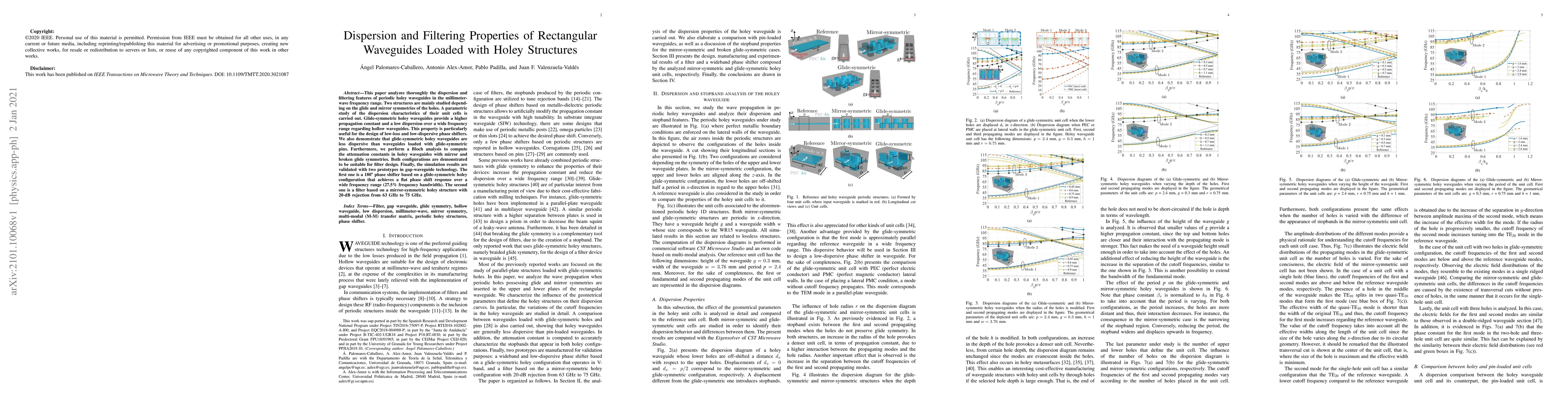 This paper analyzes thoroughly the dispersion and filtering features of periodic holey waveguides in the millimeter-wave frequency range. Two structures are mainly studied depending on the glide and mirror symmetries of the holes. A parametric study of the dispersion characteristics of their unit cells is carried out. Glide-symmetric holey waveguides provide a higher propagation constant and a low dispersion over a wide frequency range regarding hollow waveguides. This property is particularly useful for the design of low-loss and low-dispersive phase shifters. We also demonstrate that glide-symmetric holey waveguides are less dispersive than waveguides loaded with glide-symmetric pins. Furthermore, we perform a Bloch analysis to compute the attenuation constants in holey waveguides with mirror and broken glide symmetries. Both configurations are demonstrated to be suitable for filter design. Finally, the simulation results are validated with two prototypes in gap-waveguide technology. The first one is a 180$^{o}$ phase shifter based on a glide-symmetric holey configuration that achieves a flat phase shift response over a wide frequency range (27.5\% frequency bandwidth). The second one is a filter based on a mirror-symmetric holey structure with 20-dB rejection from 63 GHz to 75 GHz.