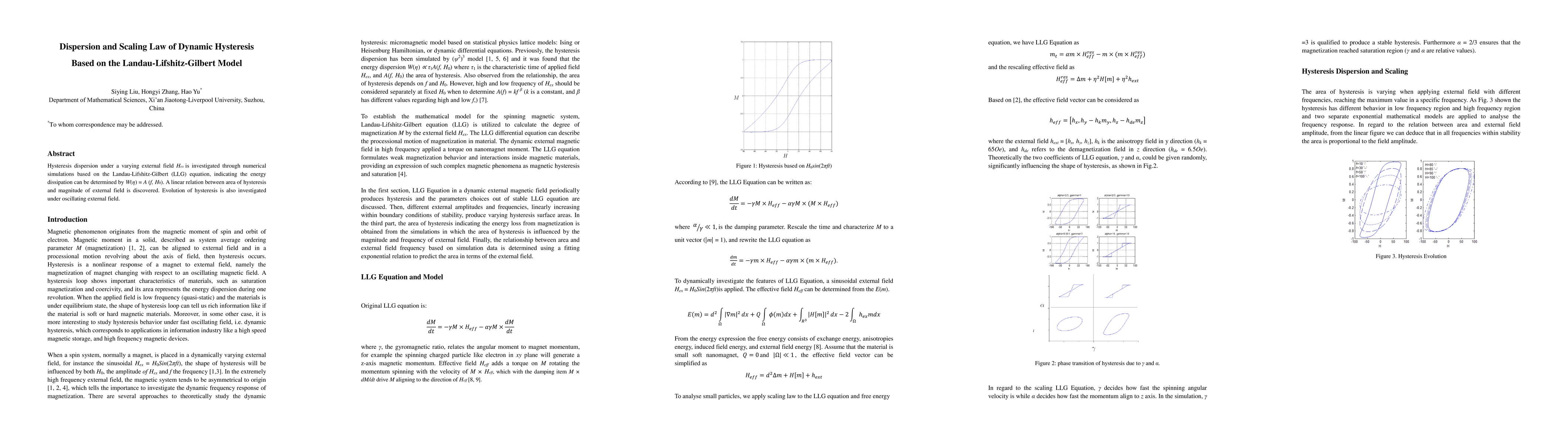 This paper investigates hysteresis dispersion using numerical simulations based on the Landau-Lifshitz-Gilbert model, revealing a linear relation between hysteresis area and external field magnitude, and explores the dynamic hysteresis evolution under oscillating external fields.