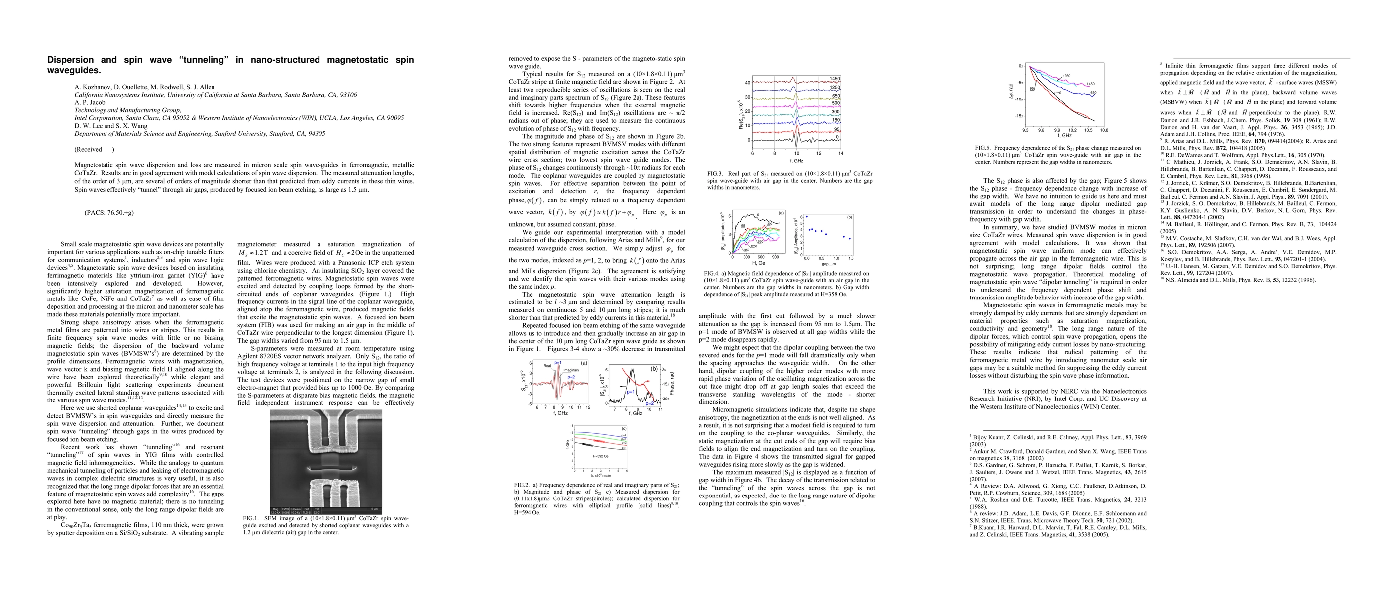 Researchers measured spin wave dispersion and loss in micron-scale guides in ferromagnetic CoTaZr, finding attenuation lengths of 3 um, much shorter than predicted eddy currents, and 'tunneling' through air gaps up to 1.5 um.