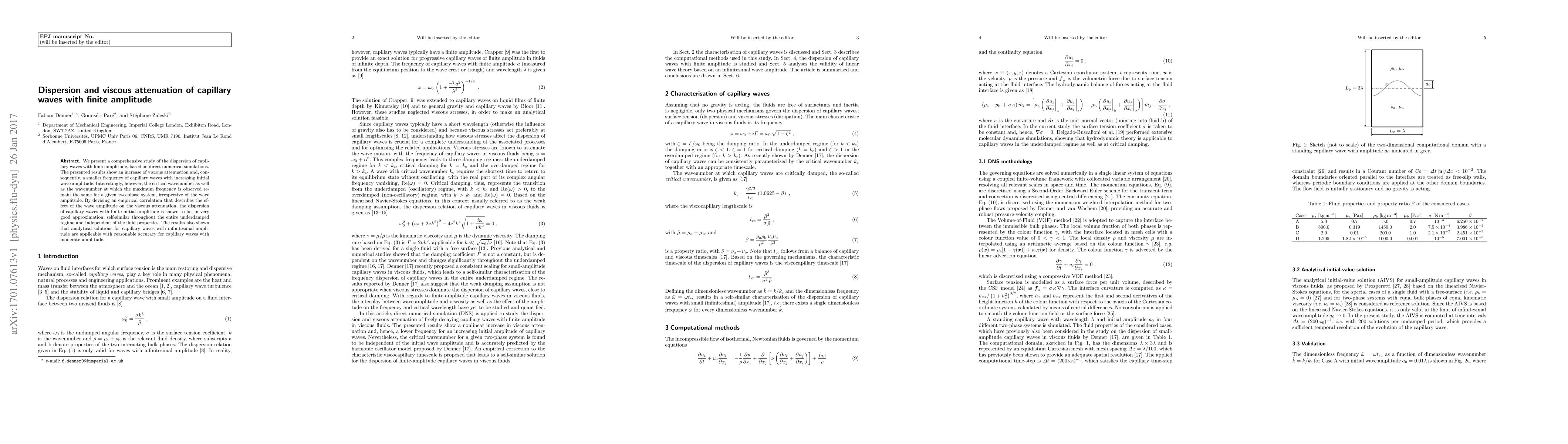 This study investigates the dispersion and viscous attenuation of capillary waves with finite amplitude through direct numerical simulations, revealing that higher initial wave amplitudes increase viscous attenuation and decrease wave frequency. Despite this, the critical wavenumber and maximum frequency wavenumber remain unchanged for a given system, and an empirical correlation shows self-similarity in dispersion across the underdamped regime.