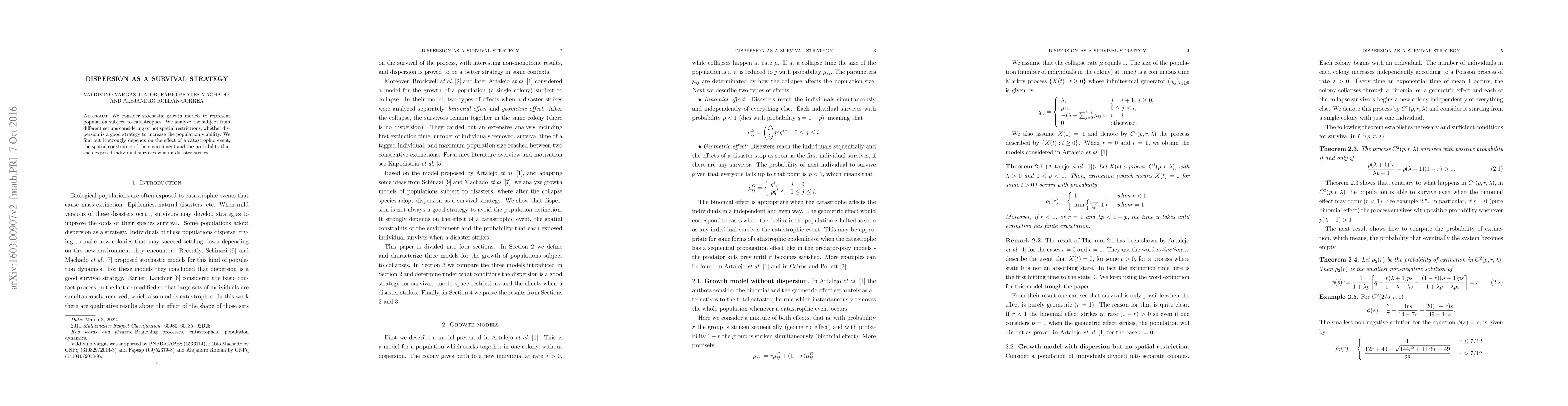 We consider stochastic growth models to represent population subject to catastrophes. We analyze the subject from different set ups considering or not spatial restrictions, whether dispersion is a good strategy to increase the population viability. We find out it strongly depends on the effect of a catastrophic event, the spatial constraints of the environment and the probability that each exposed individual survives when a disaster strikes.