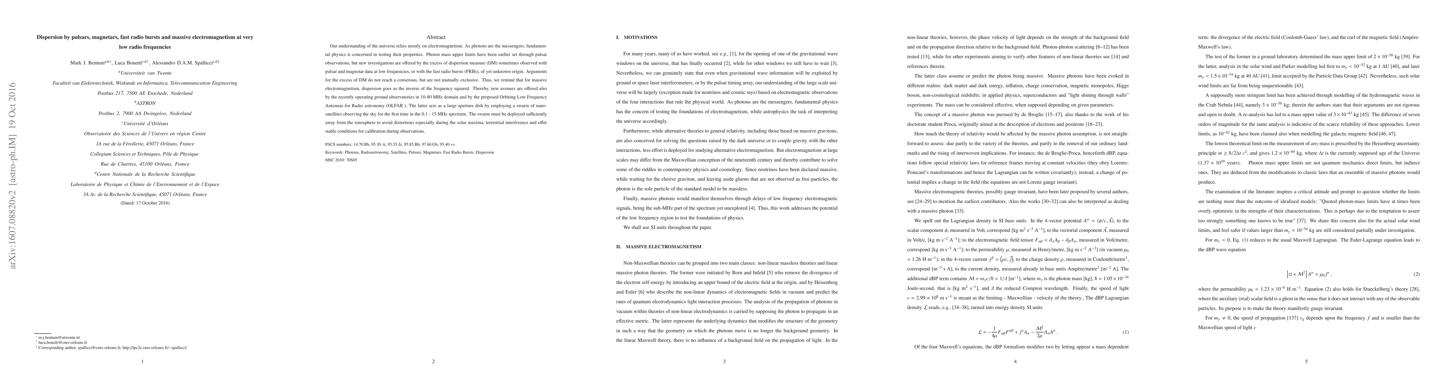 Our understanding of the universe relies mostly on electromagnetism. As photons are the messengers, fundamental physics is concerned in testing their properties. Photon mass upper limits have been earlier set through pulsar observations, but new investigations are offered by the excess of dispersion measure (DM) sometimes observed with pulsar and magnetar data at low frequencies, or with the fast radio bursts (FRBs), of yet unknown origin. Arguments for the excess of DM do not reach a consensus, but are not mutually exclusive. Thus, we remind that for massive electromagnetism, dispersion goes as the inverse of the frequency squared. Thereby, new avenues are offered also by the recently operating ground observatories in 10-80 MHz domain and by the proposed Orbiting Low Frequency Antennas for Radio astronomy (OLFAR). The latter acts as a large aperture dish by employing a swarm of nano-satellites observing the sky for the first time in the 0.1 - 15 MHz spectrum. The swarm must be deployed sufficiently away from the ionosphere to avoid distortions especially during the solar maxima, terrestrial interference and offer stable conditions for calibration during observations.