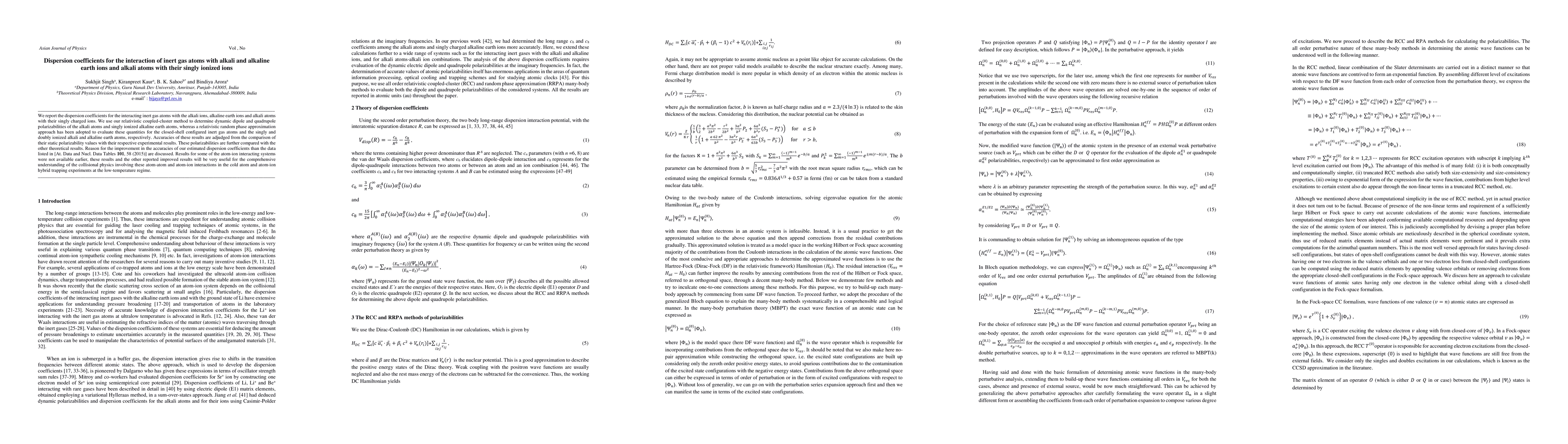 This paper reports dispersion coefficients for inert gas atoms interacting with alkali and alkaline earth ions and atoms with their singly charged ions, determined using relativistic methods. The accuracy of the calculated dynamic polarizabilities is validated against experimental and other theoretical data, highlighting improvements over previous results and providing new insights into low-temperature atom-ion collisional physics.
