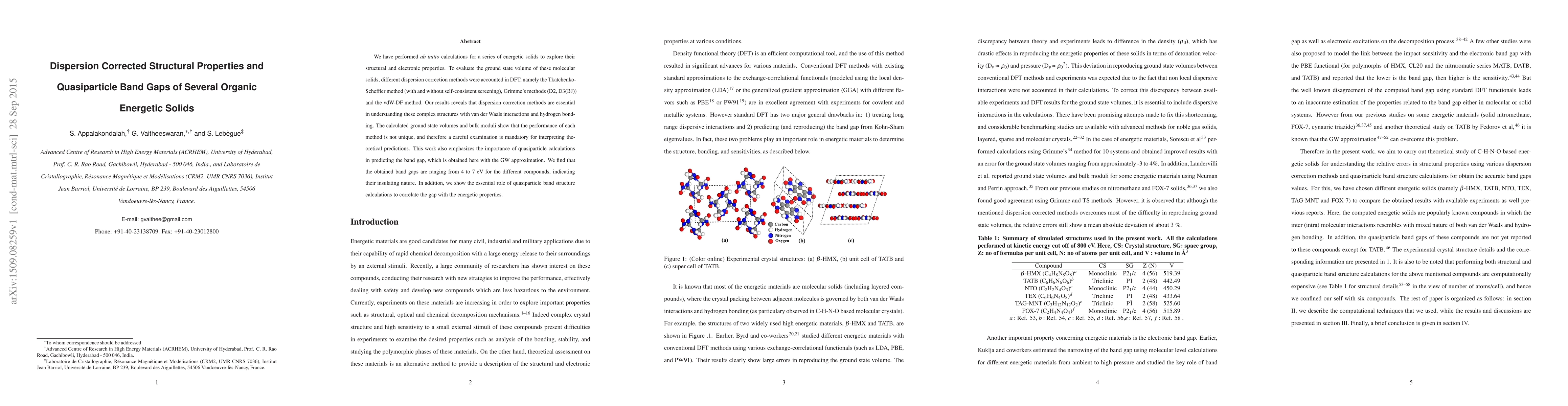 We have performed {\it ab initio} calculations for a series of energetic solids to explore their structural and electronic properties. To evaluate the ground state volume of these molecular solids, different dispersion correction methods were accounted in DFT, namely the Tkatchenko-Scheffler method (with and without self-consistent screening), Grimme's methods (D2, D3(BJ)) and the vdW-DF method. Our results reveals that dispersion correction methods are essential in understanding these complex structures with van der Waals interactions and hydrogen bonding. The calculated ground state volumes and bulk moduli show that the performance of each method is not unique, and therefore a careful examination is mandatory for interpreting theoretical predictions. This work also emphasizes the importance of quasiparticle calculations in predicting the band gap, which is obtained here with the GW approximation. We find that the obtained band gaps are ranging from 4 to 7 eV for the different compounds, indicating their insulating nature. In addition, we show the essential role of quasiparticle band structure calculations to correlate the gap with the energetic properties.