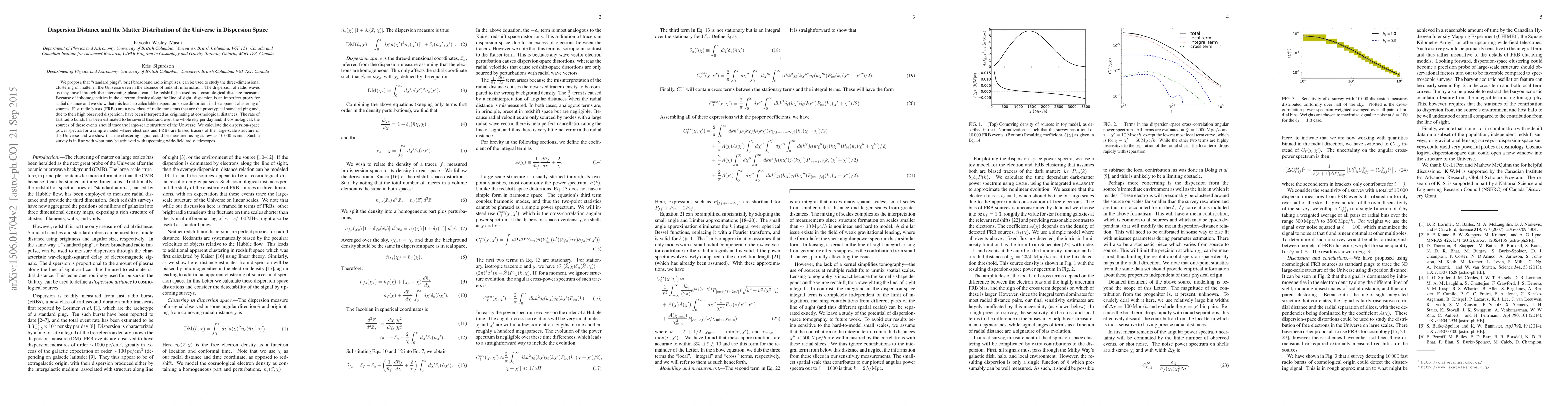We propose that "standard pings", brief broadband radio impulses, can be used to study the three-dimensional clustering of matter in the Universe even in the absence of redshift information. The dispersion of radio waves as they travel through the intervening plasma can, like redshift, be used as a cosmological distance measure. Because of inhomogeneities in the electron density along the line of sight, dispersion is an imperfect proxy for radial distance and we show that this leads to calculable dispersion-space distortions in the apparent clustering of sources. Fast radio bursts (FRBs) are a new class of radio transients that are the prototypical standard ping and, due to their high observed dispersion, have been interpreted as originating at cosmological distances. The rate of fast radio bursts has been estimated to be several thousand over the whole sky per day and, if cosmological, the sources of these events should trace the large-scale structure of the Universe. We calculate the dispersion-space power spectra for a simple model where electrons and FRBs are biased tracers of the large-scale structure of the Universe and we show that the clustering signal could be measured using as few as 10 000 events. Such a survey is in line with what may be achieved with upcoming wide-field radio telescopes.