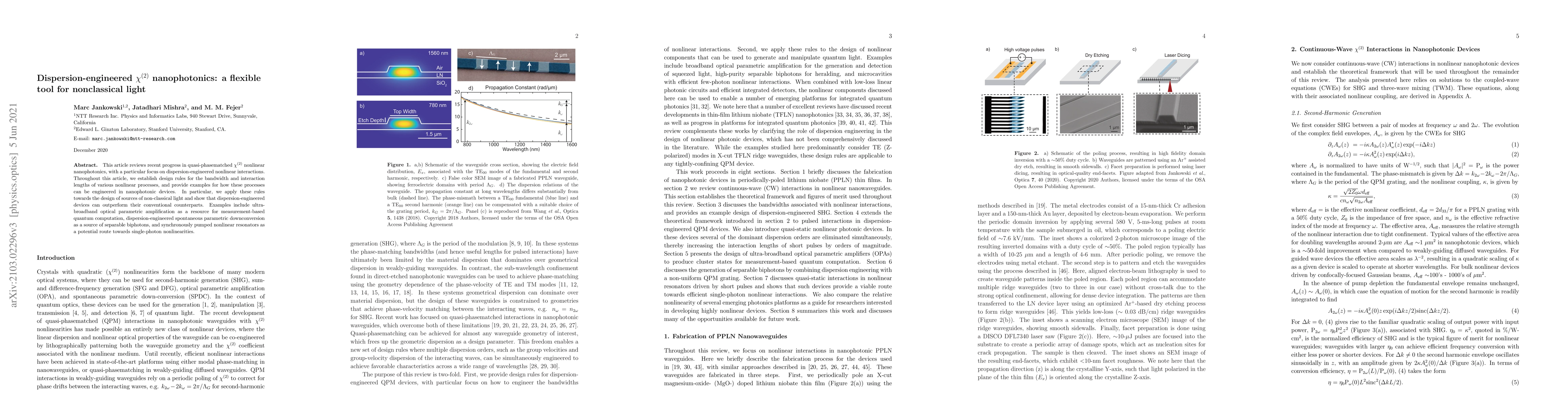 This article reviews recent progress in quasi-phasematched $\chi^{(2)}$ nonlinear nanophotonics, with a particular focus on dispersion-engineered nonlinear interactions. Throughout this article, we establish design rules for the bandwidth and interaction lengths of various nonlinear processes, and provide examples for how these processes can be engineered in nanophotonic devices. In particular, we apply these rules towards the design of sources of non-classical light and show that dispersion-engineered devices can outperform their conventional counterparts. Examples include ultra-broadband optical parametric amplification as a resource for measurement-based quantum computation, dispersion-engineered spontaneous parametric downconversion as a source of separable biphotons, and synchronously pumped nonlinear resonators as a potential route towards single-photon nonlinearities.
