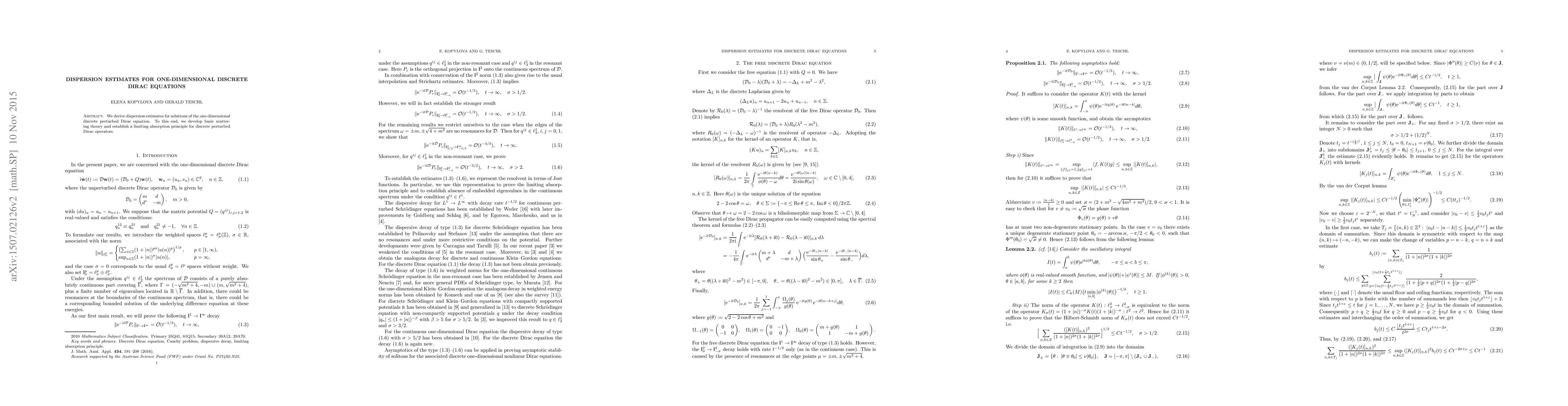 We derive dispersion estimates for solutions of the one-dimensional discrete perturbed Dirac equation. To this end we develop basic scattering theory and establish a limiting absorption principle for discrete perturbed Dirac operators.