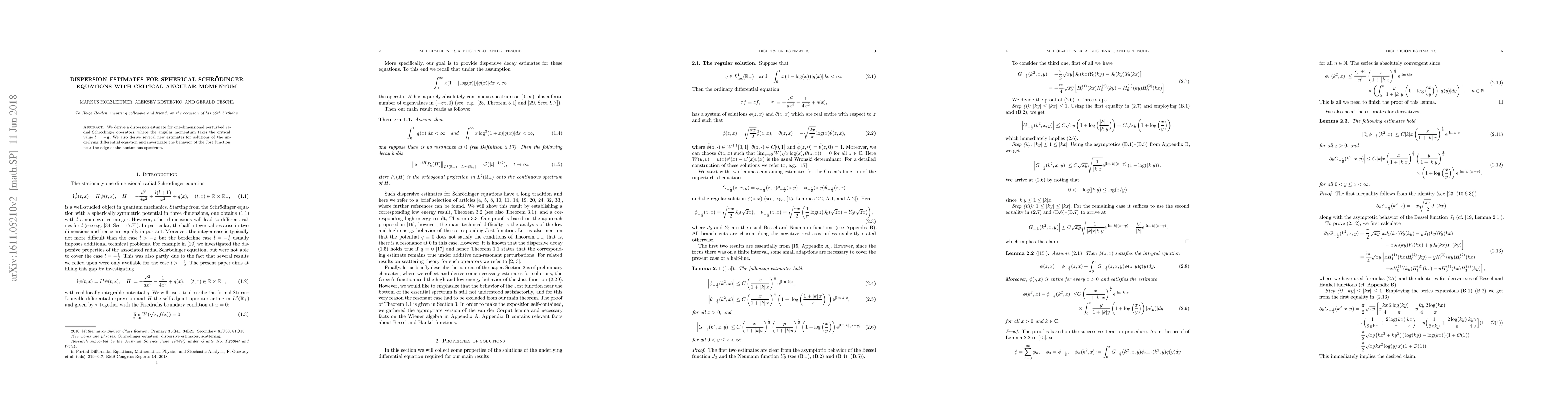 This paper derives a dispersion estimate for perturbed radial Schrödinger operators with critical angular momentum $l = -\frac{1}{2}$, and provides new estimates for solutions of the associated differential equation, along with an analysis of the Jost function's behavior near the continuous spectrum edge.