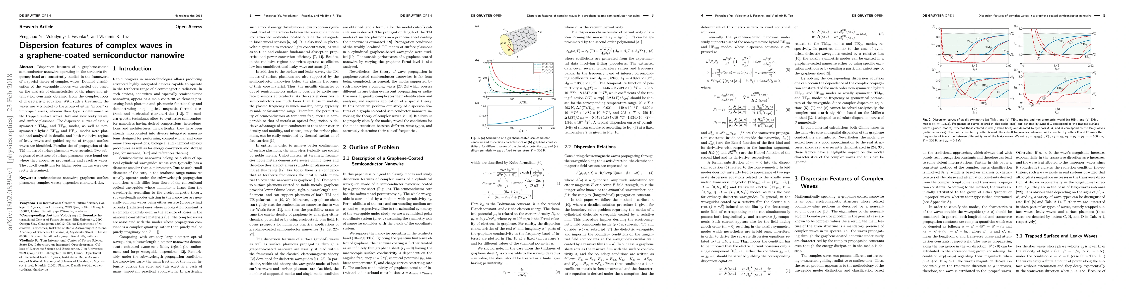 This paper investigates the dispersion characteristics of complex waves in a graphene-coated semiconductor nanowire in the terahertz band, classifying waveguide modes based on phase and attenuation constants. The study identifies various wave types, including trapped surface waves, leaky waves, and surface plasmons, and determines the conditions for their propagation.