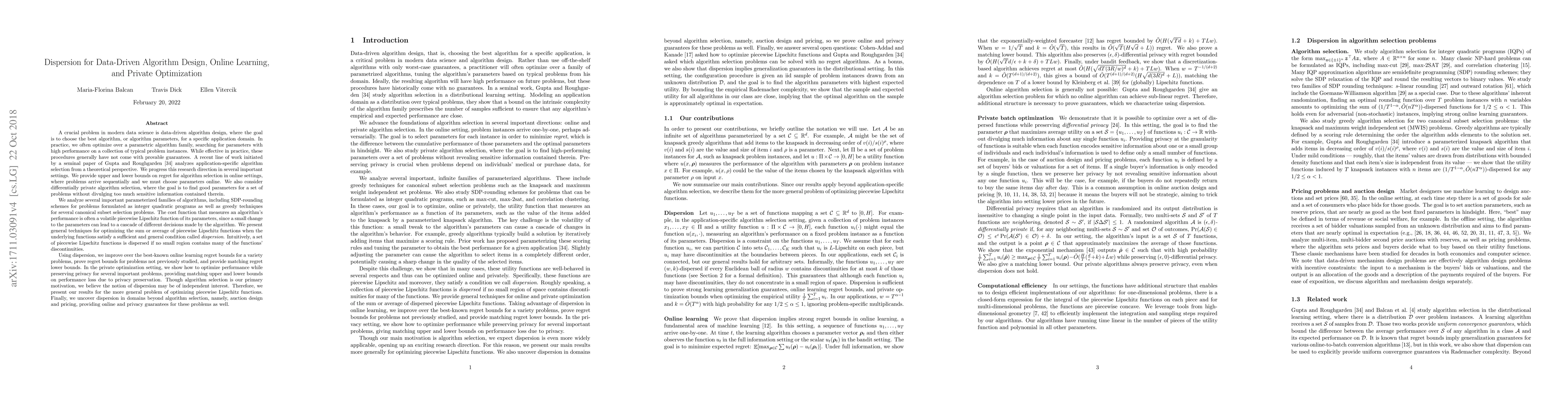 Data-driven algorithm design, that is, choosing the best algorithm for a specific application, is a crucial problem in modern data science. Practitioners often optimize over a parameterized algorithm family, tuning parameters based on problems from their domain. These procedures have historically come with no guarantees, though a recent line of work studies algorithm selection from a theoretical perspective. We advance the foundations of this field in several directions: we analyze online algorithm selection, where problems arrive one-by-one and the goal is to minimize regret, and private algorithm selection, where the goal is to find good parameters over a set of problems without revealing sensitive information contained therein. We study important algorithm families, including SDP-rounding schemes for problems formulated as integer quadratic programs, and greedy techniques for canonical subset selection problems. In these cases, the algorithm's performance is a volatile and piecewise Lipschitz function of its parameters, since tweaking the parameters can completely change the algorithm's behavior. We give a sufficient and general condition, dispersion, defining a family of piecewise Lipschitz functions that can be optimized online and privately, which includes the functions measuring the performance of the algorithms we study. Intuitively, a set of piecewise Lipschitz functions is dispersed if no small region contains many of the functions' discontinuities. We present general techniques for online and private optimization of the sum of dispersed piecewise Lipschitz functions. We improve over the best-known regret bounds for a variety of problems, prove regret bounds for problems not previously studied, and give matching lower bounds. We also give matching upper and lower bounds on the utility loss due to privacy. Moreover, we uncover dispersion in auction design and pricing problems.