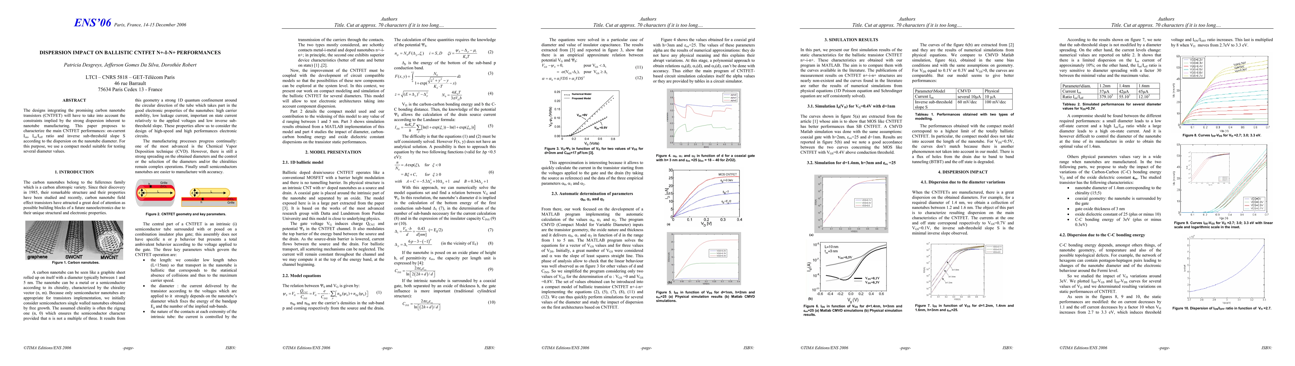 The designs integrating the promising carbon nanotube transistors (CNTFET) will have to take into account the constraints implied by the strong dispersion inherent to nanotube manufacturing. This paper proposes to characterize the main CNTFET performances : on-current Ion, Ion/Ioff ratio and inverse sub-threshold slope S according to the dispersion on the nanotube diameter. For this purpose, we use a compact model suitable for testing several diameter values.