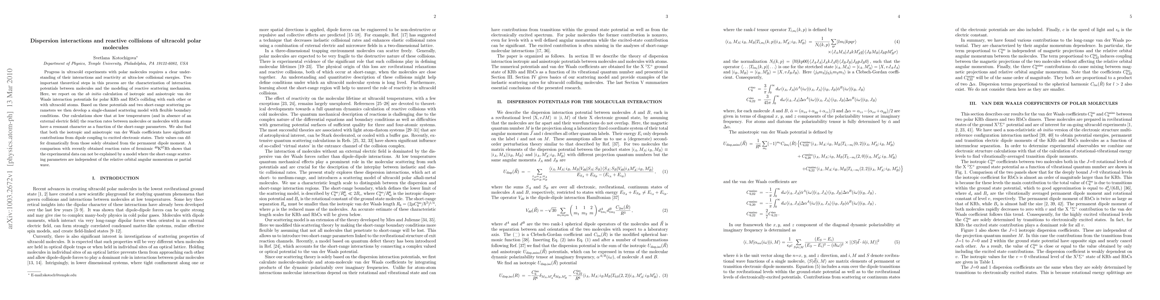 Progress in ultracold experiments with polar molecules requires a clear understanding of their interactions and reactivity at ultra-low collisional energies. Two important theoretical steps in this process are the characterization of interaction potentials between molecules and the modeling of reactive scattering mechanism. Here, we report on the {\it abinitio} calculation of isotropic and anisotropic van der Waals interaction potentials for polar KRb and RbCs colliding with each other or with ultracold atoms. Based on these potentials and two short-range scattering parameters we then develop a single-channel scattering model with flexible boundary conditions. Our calculations show that at low temperatures (and in absence of an external electric field) the reaction rates between molecules or molecules with atoms have a resonant character as a function of the short-range parameters. We also find that both the isotropic and anisotropic van der Waals coefficients have significant contributions from dipole coupling to excited electronic states. Their values can differ dramatically from those solely obtained from the permanent dipole moment. A comparison with recently obtained reaction rates of fermionic $^{40}$K$^{87}$Rb shows that the experimental data can not be explained by a model where the short-range scattering parameters are independent of the relative orbital angular momentum or partial wave.