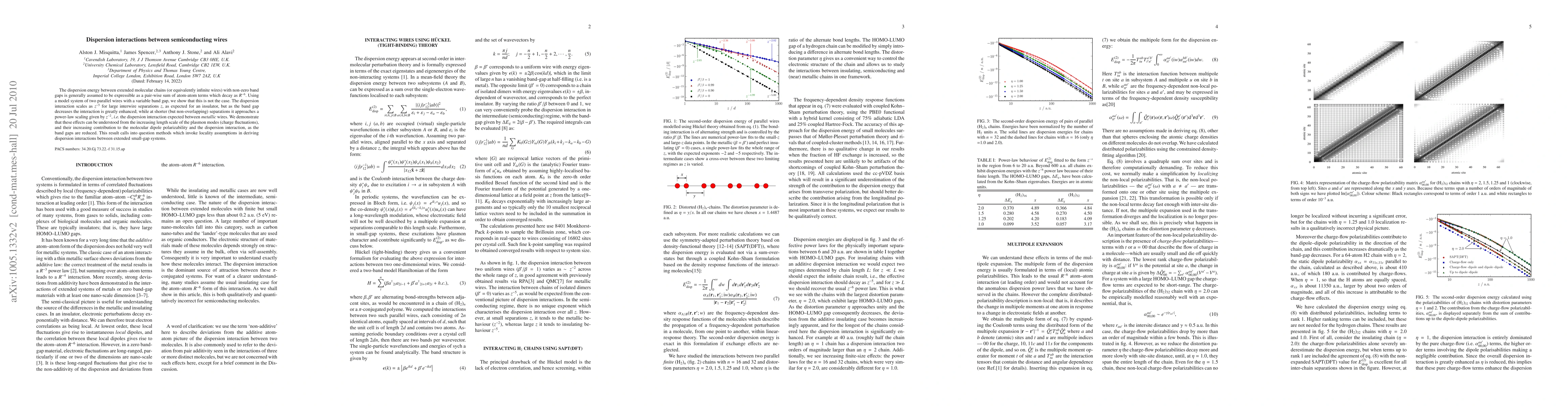 The dispersion interaction between semiconducting wires is found to scale differently depending on the band gap size, deviating from the expected $R^{-6}$ decay law. It behaves like an insulator at large distances but approaches metallic behavior at shorter separations.