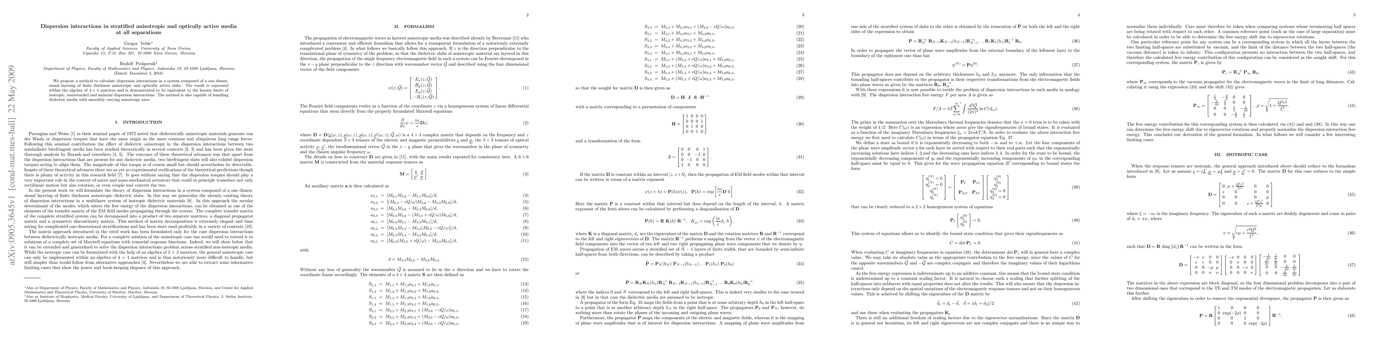 This paper presents a novel method for calculating dispersion interactions in stratified anisotropic and optically active media, expressed through 4x4 matrix algebra, and validated against known limits for isotropic and nonretarded interactions, applicable to media with smoothly varying anisotropy.