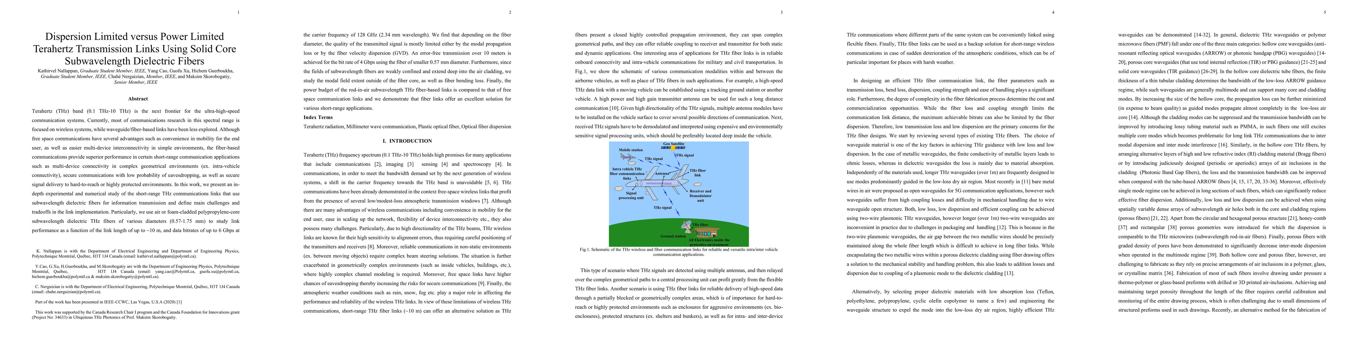 This research investigates short-range THz communication using subwavelength dielectric fibers, finding that transmission quality is influenced by either modal propagation loss or fiber velocity dispersion, depending on fiber diameter. Error-free 4 Gbps transmission over 10 meters is achieved using a 0.57 mm diameter fiber, highlighting fiber's advantages over free space for short-range applications.