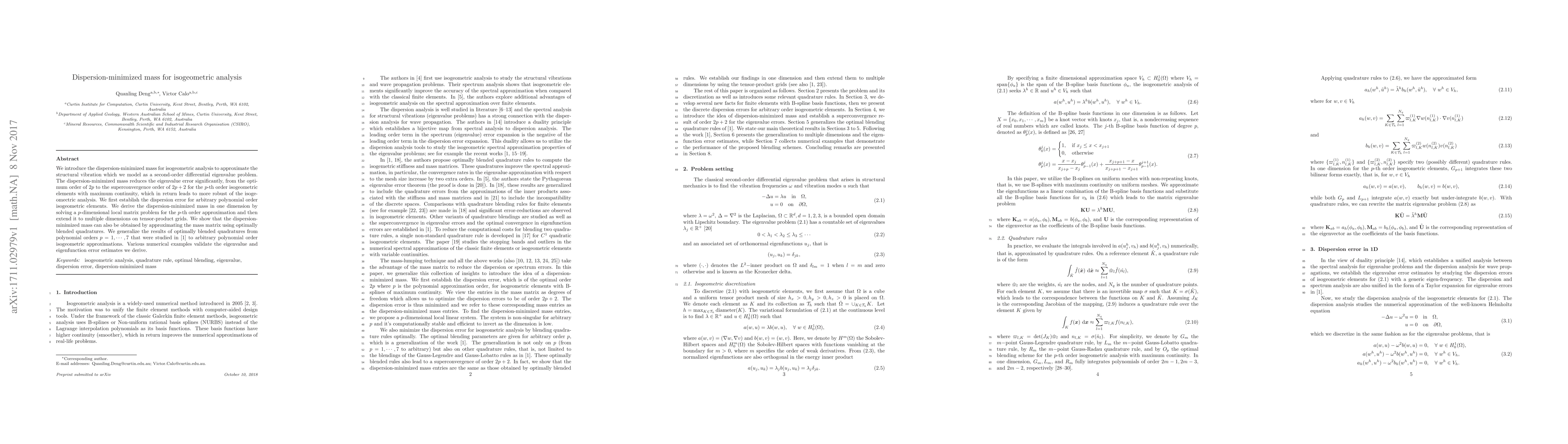 This paper introduces a dispersion-minimized mass for isogeometric analysis to improve structural vibration approximation, reducing eigenvalue error from $2p$ to $2p+2$ for $p$-th order elements. The method is validated through numerical examples and extends optimally blended quadratures to arbitrary polynomial orders.