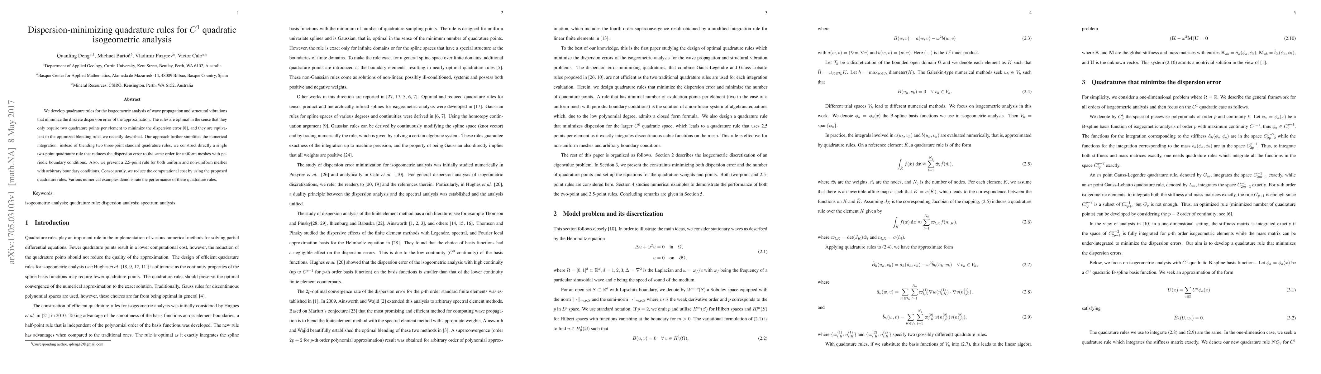 We develop quadrature rules for the isogeometric analysis of wave propagation and structural vibrations that minimize the discrete dispersion error of the approximation. The rules are optimal in the sense that they only require two quadrature points per element to minimize the dispersion error [1], and they are equivalent to the optimized blending rules we recently described. Our approach further simplifies the numerical integration: instead of blending two three-point standard quadrature rules, we construct directly a single two-point quadrature rule that reduces the dispersion error to the same order for uniform meshes with periodic boundary conditions. Also, we present a 2.5-point rule for both uniform and non-uniform meshes with arbitrary boundary conditions. Consequently, we reduce the computational cost by using the proposed quadrature rules. Various numerical examples demonstrate the performance of these quadrature rules.