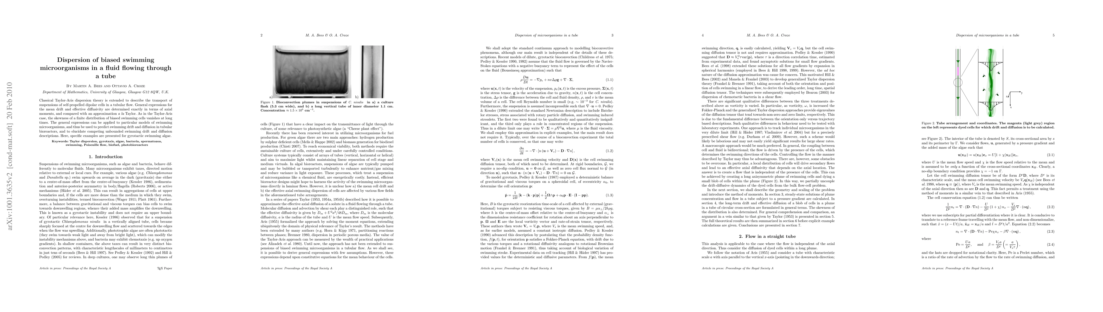 This paper extends the Taylor-Aris dispersion theory to model the transport of self-propelled dipolar cells in tubular flow, determining exact expressions for mean drift and effective diffusivity. The study applies these findings to predict the behavior of swimming microorganisms like gyrotactic algae in tubular bioreactors.