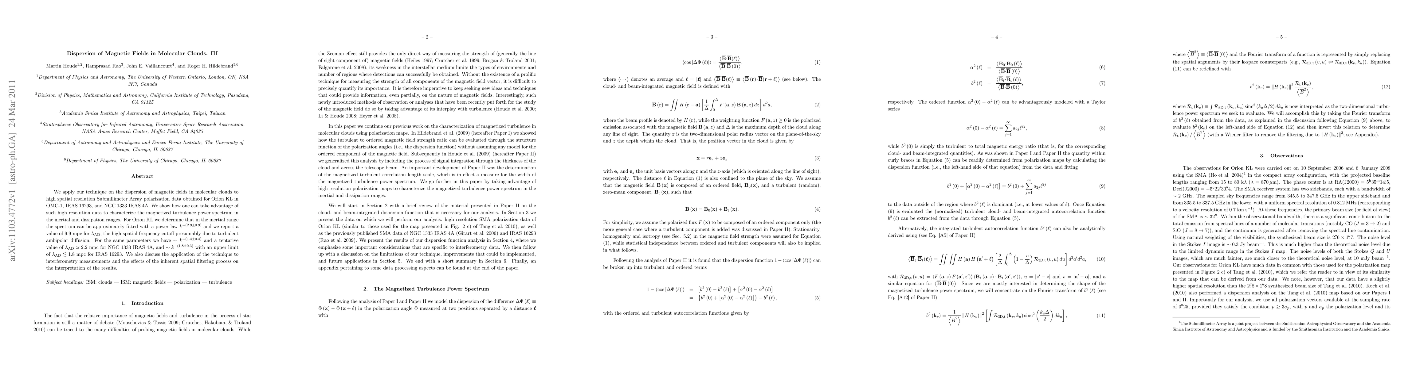 This paper analyzes high-resolution polarization data from the Submillimeter Array to study magnetic field dispersion in molecular clouds, finding power law spectra in the inertial range and estimating cutoff scales for turbulent ambipolar diffusion in Orion KL, NGC 1333 IRAS 4A, and IRAS 16293. The results highlight the technique's potential for interferometry and its spatial filtering effects.