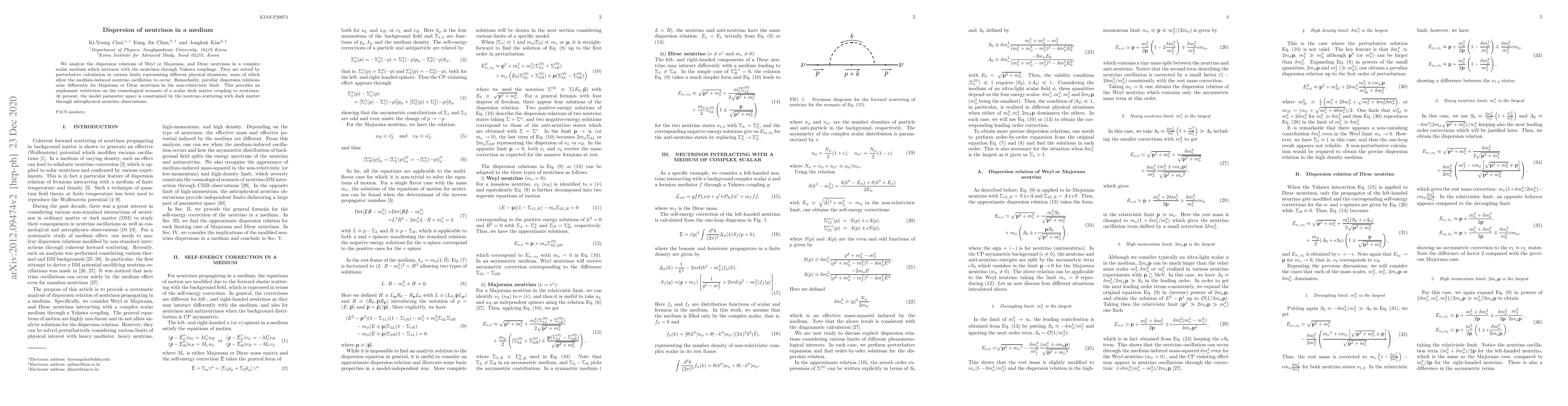 We analyze the dispersion relations of Weyl or Majorana, and Dirac neutrinos in a complex scalar medium which interacts with the neutrinos through Yukawa couplings. They are solved by perturbative calculation in various limits representing different physical situations, some of which allow the medium-induced neutrino oscillation to occur. Remarkably, peculiar dispersion relations arise differently for Majorana or Dirac neutrinos in the non-relativistic limit. This provides an unpleasant restriction on the cosmological scenario of a scalar dark matter coupling to neutrinos. At present, the model parameter space is constrained by the neutrino scattering with dark matter through astrophysical neutrino observations.