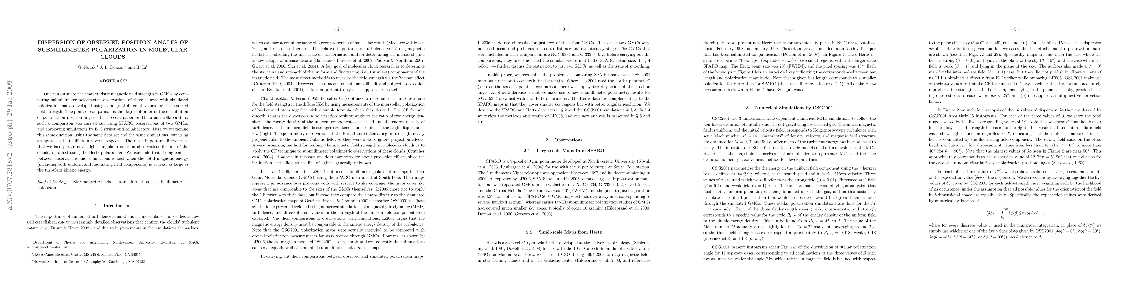 This paper reexamines the dispersion of polarization position angles in molecular clouds using higher resolution observations and simulations, concluding that the best agreement between observations and simulations occurs when the magnetic energy matches or exceeds the turbulent kinetic energy.
