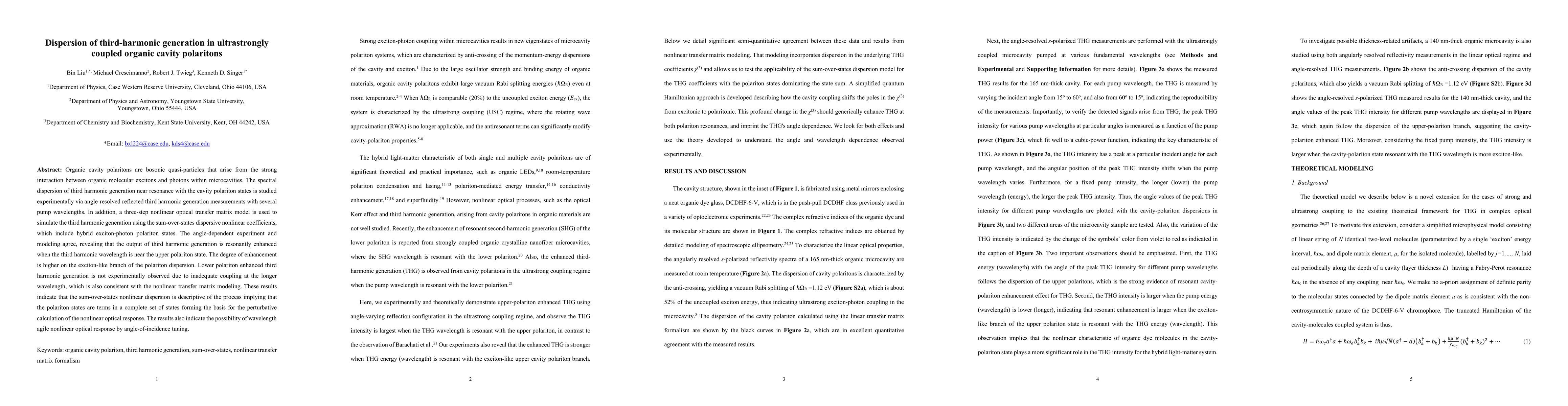 Organic cavity polaritons are bosonic quasi-particles that arise from the strong interaction between organic molecular excitons and photons within microcavities. The spectral dispersion of third harmonic generation near resonance with the cavity polariton states is studied experimentally via angle-resolved reflected third harmonic generation measurements with several pump wavelengths. In addition, a three-step nonlinear optical transfer matrix model is used to simulate the third harmonic generation using the sum-over-states dispersive nonlinear coefficients, which include hybrid exciton-photon polariton states. The angle-dependent experiment and modeling agree, revealing that the output of third harmonic generation is resonantly enhanced when the third harmonic wavelength is near the upper polariton state. The degree of enhancement is higher on the exciton-like branch of the polariton dispersion. Lower polariton enhanced third harmonic generation is not experimentally observed due to inadequate coupling at the longer wavelength, which is also consistent with the nonlinear transfer matrix modeling. These results indicate that the sum-over-states nonlinear dispersion is descriptive of the process implying that the polariton states are terms in a complete set of states forming the basis for the perturbative calculation of the nonlinear optical response. The results also indicate the possibility of wavelength agile nonlinear optical response by angle-of-incidence tuning.
