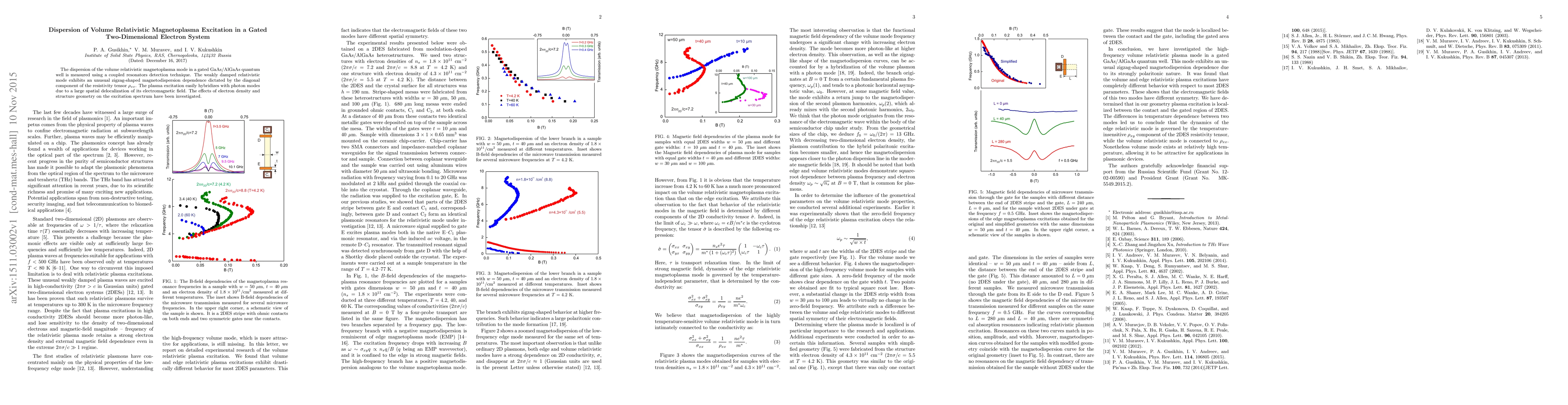 This paper measures the dispersion of relativistic magnetoplasma excitations in a gated GaAs/AlGaAs quantum well, revealing a zigzag-shaped magnetodispersion influenced by the resistivity tensor. The study also explores how electron density and structure geometry affect the hybridized excitation spectrum.
