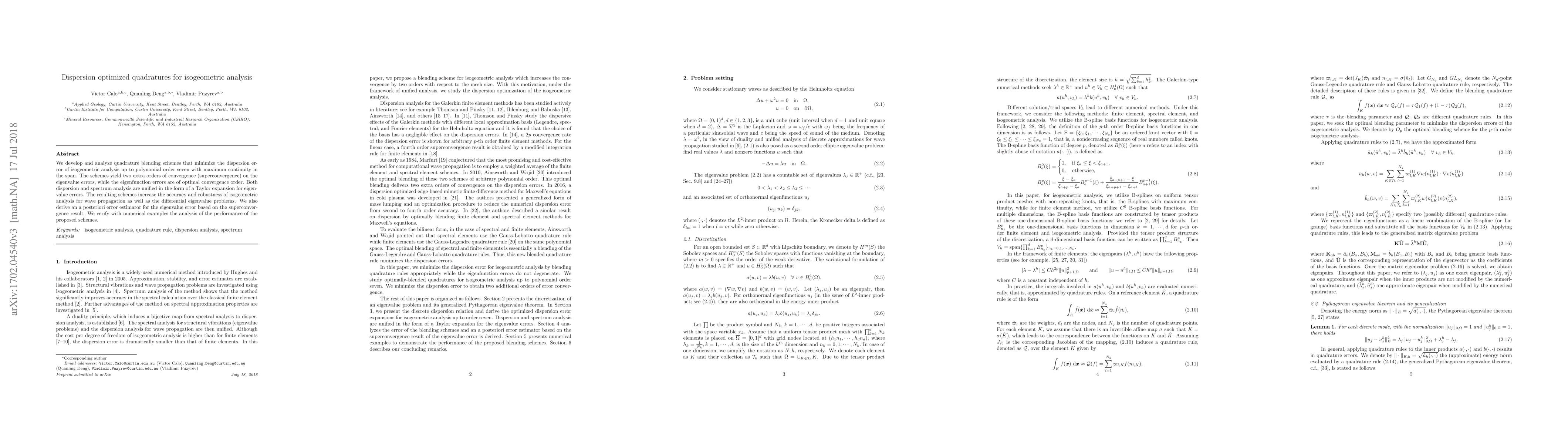 This paper develops quadrature blending schemes to minimize dispersion error in isogeometric analysis up to polynomial order seven, achieving two extra orders of convergence. The schemes enhance accuracy and robustness for wave propagation and differential eigenvalue problems, verified through numerical examples.
