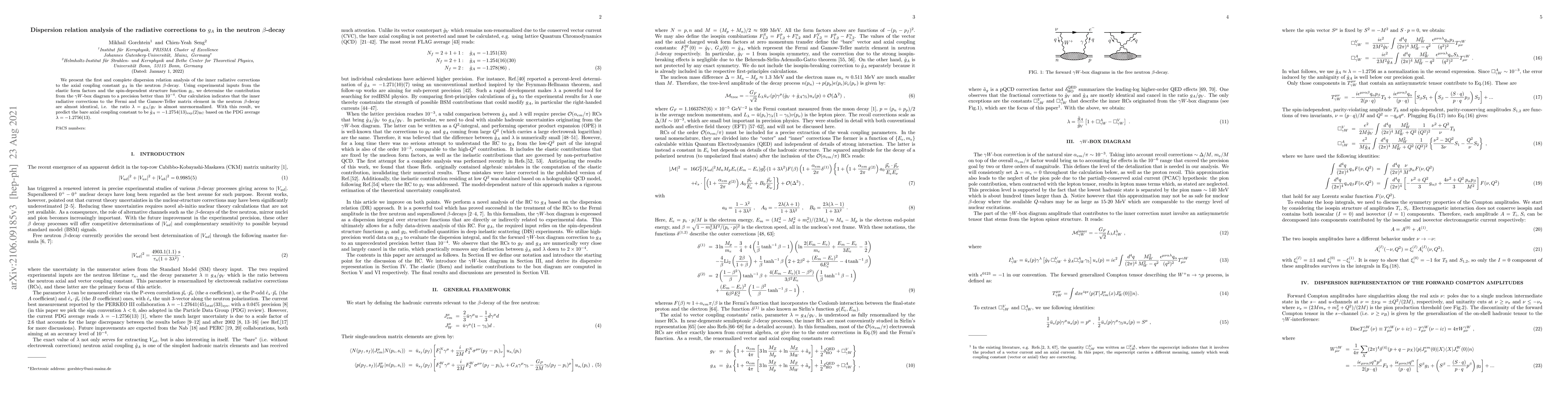 This paper conducts a detailed dispersion relation analysis of inner radiative corrections to the axial coupling constant $g_A$ in neutron $\beta$-decay, achieving a precision better than $10^{-4}$. The study finds that these corrections have negligible impact on the ratio $\lambda=g_A/g_V$, leading to a predicted bare axial coupling constant of $\mathring{g}_A=-1.2754(13)$.