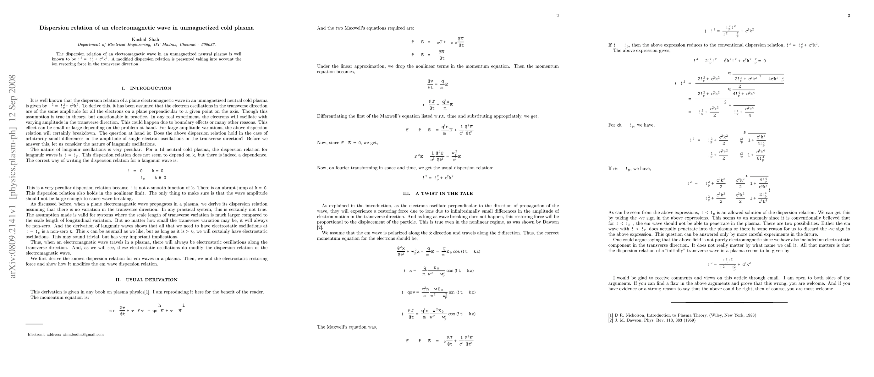 Summary: This paper presents a modified dispersion relation for electromagnetic waves in unmagnetized cold plasma, incorporating the ion restoring force in the transverse direction, deviating from the standard w^2=wp^2+(ck)^2 formula.