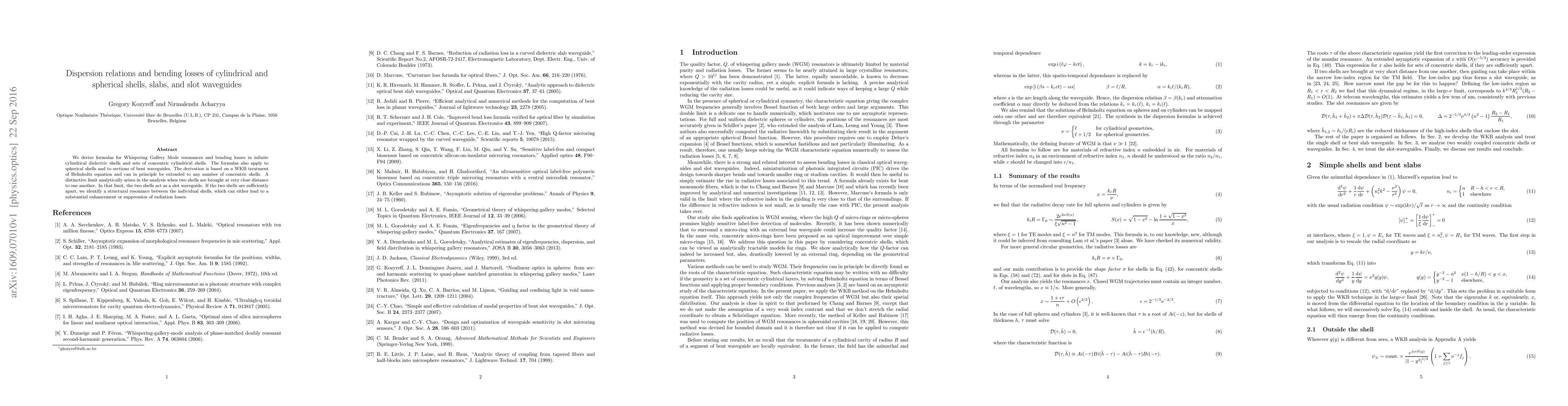 This paper derives formulas for Whispering Gallery Mode resonances and bending losses in cylindrical and spherical dielectric shells, as well as slot waveguides formed by closely spaced shells. The analysis uses WKB treatment of the Helmholtz equation, revealing potential enhancements or suppressions of radiation losses depending on the shell separation.