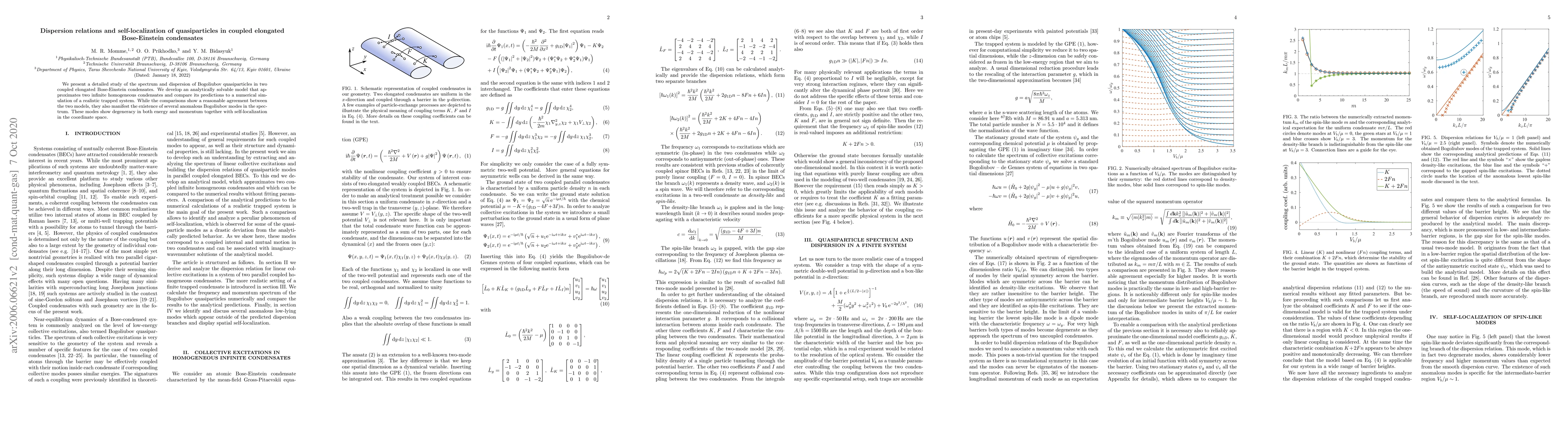 This research explores the dispersion relations of Bogoliubov quasiparticles in coupled elongated Bose-Einstein condensates, finding anomalous modes with energy-momentum degeneracy and self-localization, validated by comparing an analytically solvable model with numerical simulations of a realistic trapped system.