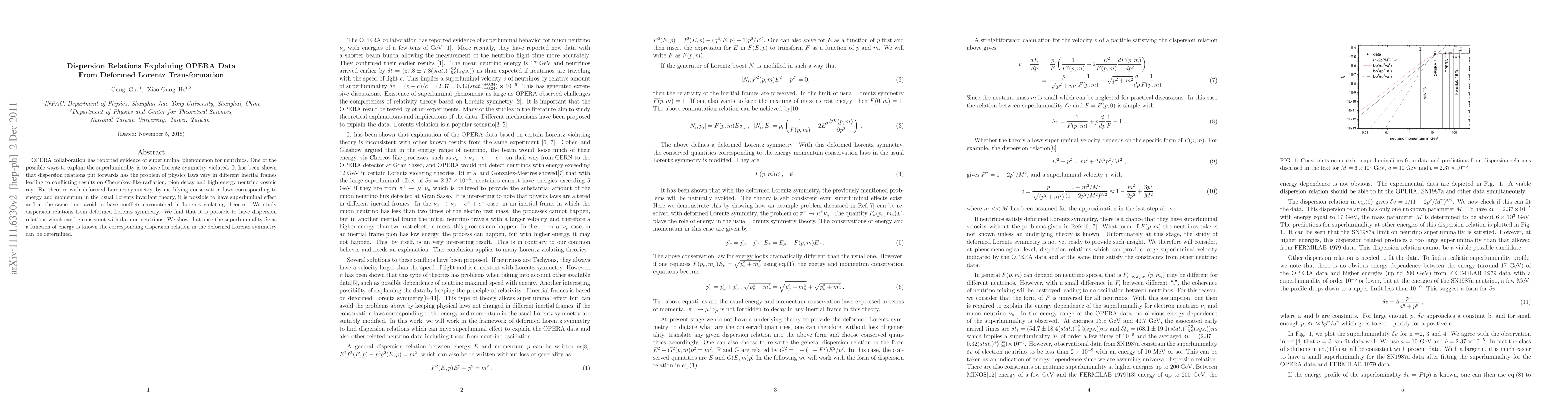 OPERA collaboration has reported evidence of superluminal phenomenon for neutrinos. One of the possible ways to explain the superluminality is to have Lorentz symmetry violated. It has been shown that dispersion relations put forwards has the problem of physics laws vary in different inertial frames leading to conflicting results on Cherenkov-like radiation, pion decay and high energy neutrino cosmic ray. For theories with deformed Lorentz symmetry, by modifying conservation laws corresponding to energy and momentum in the usual Lorentz invariant theory, it is possible to have superluminal effect and at the same time avoid to have conflicts encountered in Lorentz violating theories. We study dispersion relations from deformed Lorentz symmetry. We find that it is possible to have dispersion relations which can be consistent with data on neutrinos. We show that once the superluminality $\delta v$ as a function of energy is known the corresponding dispersion relation in the deformed Lorentz symmetry can be determined.