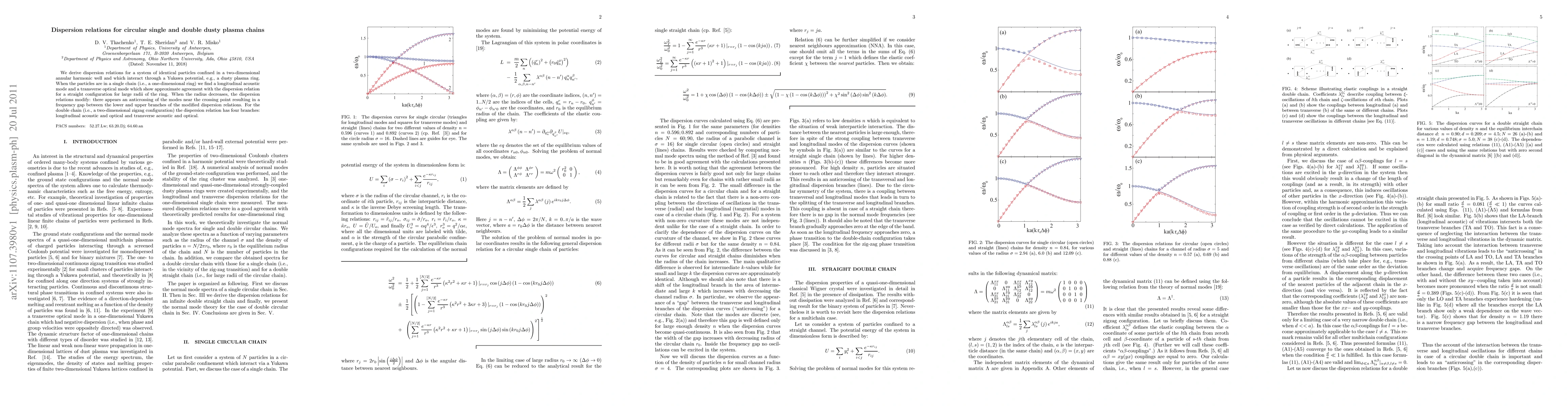 We derive dispersion relations for a system of identical particles confined in a two-dimensional annular harmonic well and which interact through a Yukawa potential, e.g., a dusty plasma ring. When the particles are in a single chain (i.e., a one-dimensional ring) we find a longitudinal acoustic mode and a transverse optical mode which show approximate agreement with the dispersion relation for a straight configuration for large radii of the ring. When the radius decreases, the dispersion relations modify: there appears an anticrossing of the modes near the crossing point resulting in a frequency gap between the lower and upper branches of the modified dispersion relations. For the double chain (i.e., a two-dimensional zigzag configuration) the dispersion relation has four branches: longitudinal acoustic and optical and transverse acoustic and optical.