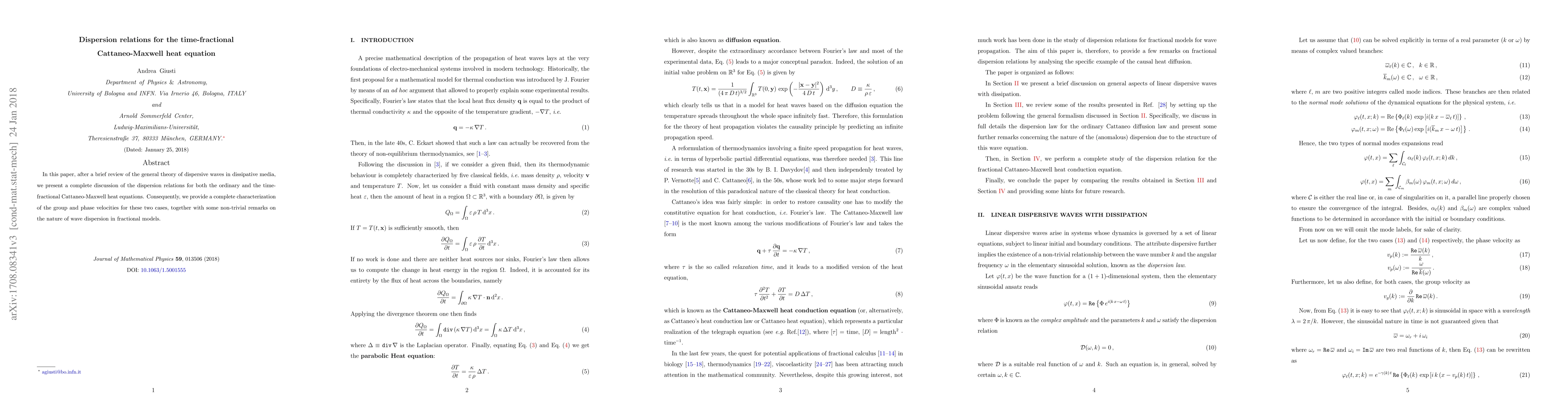 This paper reviews dispersive wave theory in dissipative media and thoroughly analyzes the dispersion relations for both the ordinary and time-fractional Cattaneo-Maxwell heat equations, providing detailed characterizations of their group and phase velocities.