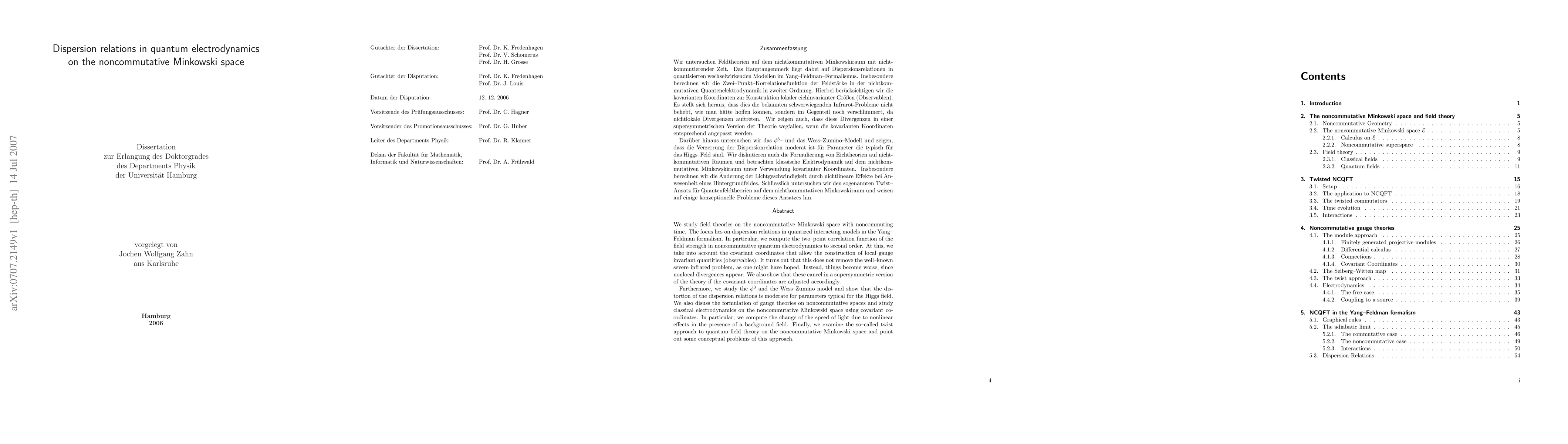 We study field theories on the noncommutative Minkowski space with noncommuting time. The focus lies on dispersion relations in quantized interacting models in the Yang-Feldman formalism. In particular, we compute the two-point correlation function of the field strength in noncommutative quantum electrodynamics to second order. At this, we take into account the covariant coordinates that allow the construction of local gauge invariant quantities (observables). It turns out that this does not remove the well-known severe infrared problem, as one might have hoped. Instead, things become worse, since nonlocal divergences appear. We also show that these cancel in a supersymmetric version of the theory if the covariant coordinates are adjusted accordingly. Furthermore, we study the phi^3 and the Wess-Zumino model and show that the distortion of the dispersion relations is moderate for parameters typical for the Higgs field. We also disuss the formulation of gauge theories on noncommutative spaces and study classical electrodynamics on the noncommutative Minkowski space using covariant coordinates. In particular, we compute the change of the speed of light due to nonlinear effects in the presence of a background field. Finally, we examine the so-called twist approach to quantum field theory on the noncommutative Minkowski space and point out some conceptual problems of this approach.